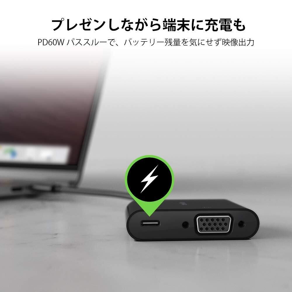 VGAコネクタ搭載のディスプレイ、テレビ、プロジェクタ等へ映像を出力することができます。60W PD 対応で充電しながら、VGAポート経由にて最大最大1920x1200 (1080p)/60Hz の画像をサポート。