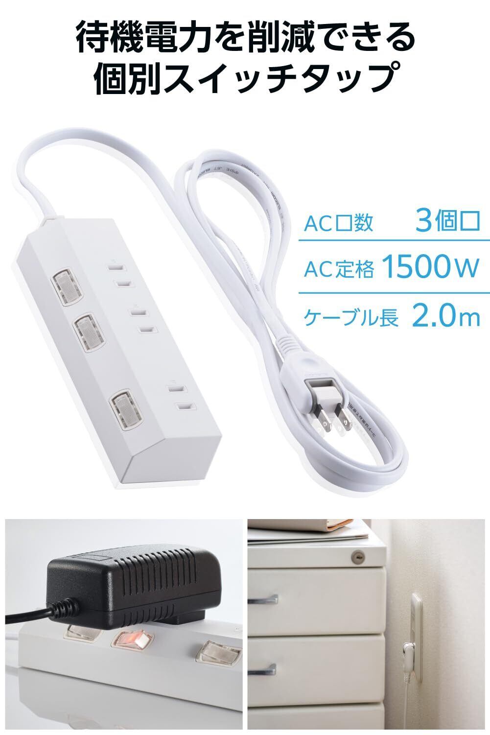 オフィスやご自宅などの、さまざまなシーンで使いやすい3個口タップです。個別スイッチで差込口ごとに、電源のON/OFFの切り替えができます。接続機器の電源がOFFの状態でも電力を消費する待機電力を削減し、電気代の節約に役立ちます。また、使用しない機器の電源管理もしやすくなります。