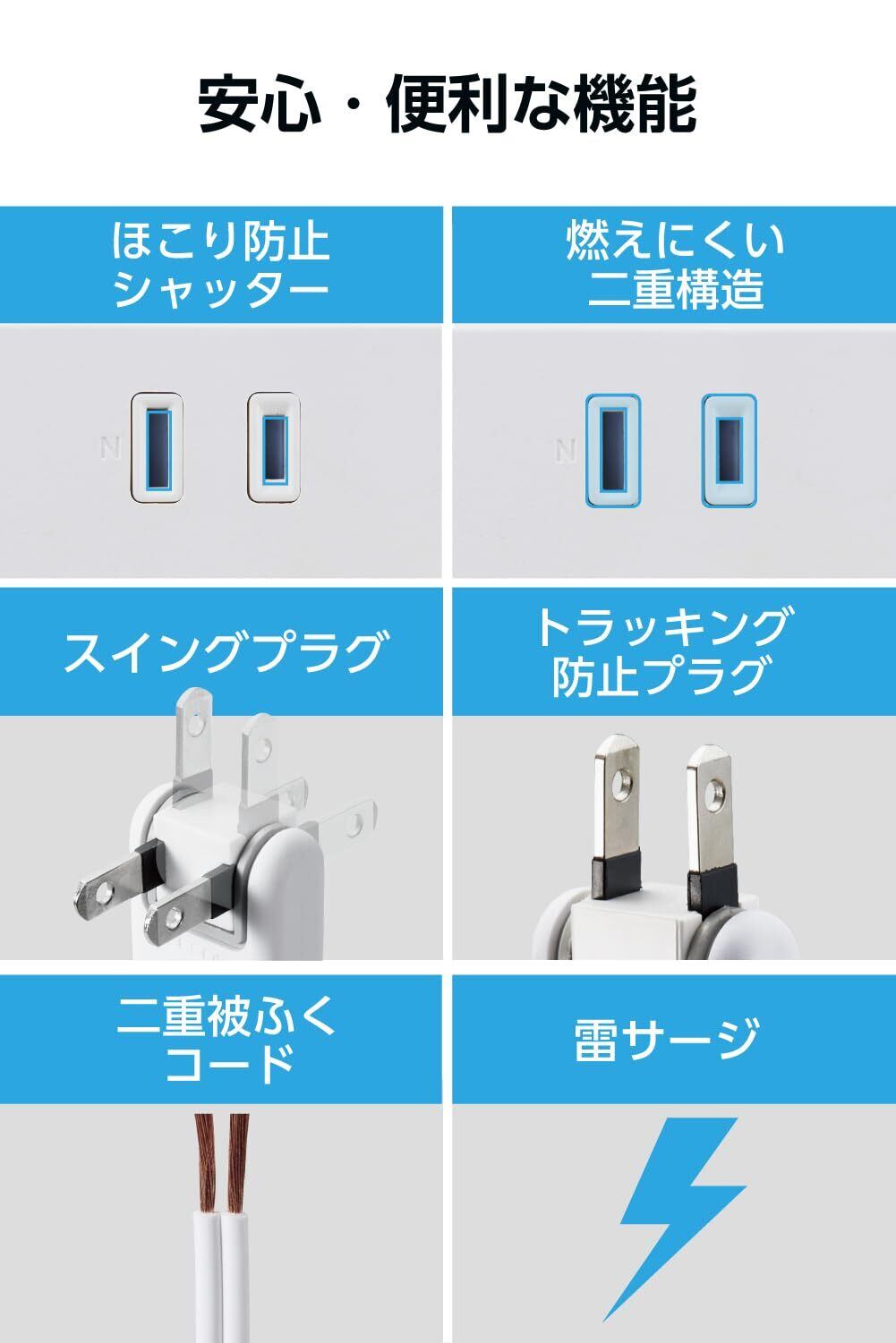 「ほこりシャッター機能が付いており、使用していないポートを清潔に保つことができます。さらに、雷ガード機能により、急激な電圧の変化から大事なデバイスを守る安心感を提供します。」