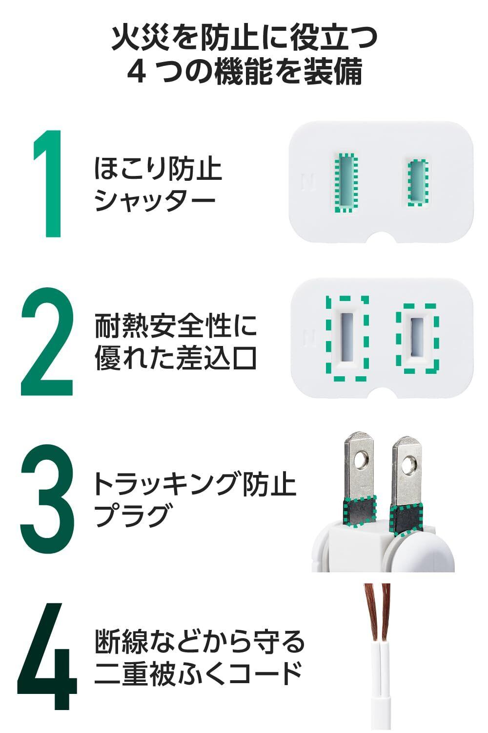 「この電源タップには、ほこり防止シャッター機能が付いており、未使用時には差込口の清潔を保ちます。また、スイング式プラグを採用しているため、狭いスペースでも配線がしやすく、使用時のストレスを軽減します。」