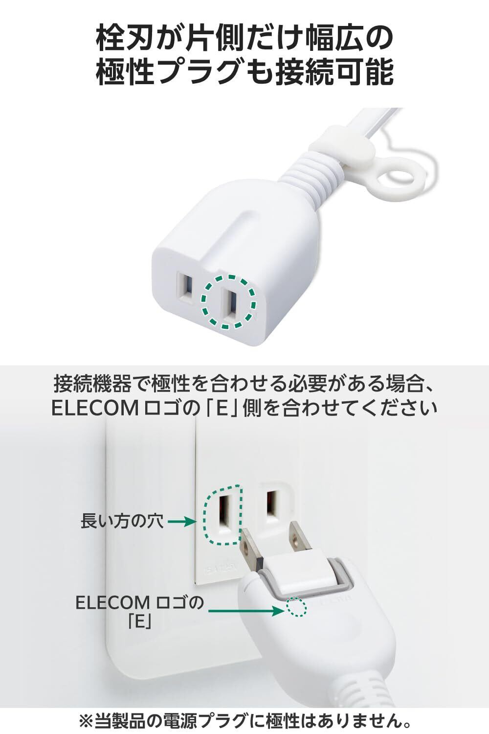 ■接続機器で極性を合わせる必要がある場合、コンセントの長い方の穴と電源プラグにあるELECOMロゴ(ELECOMとだけ書かれている面)の頭文字「E」側を合わせて挿し込んでください。