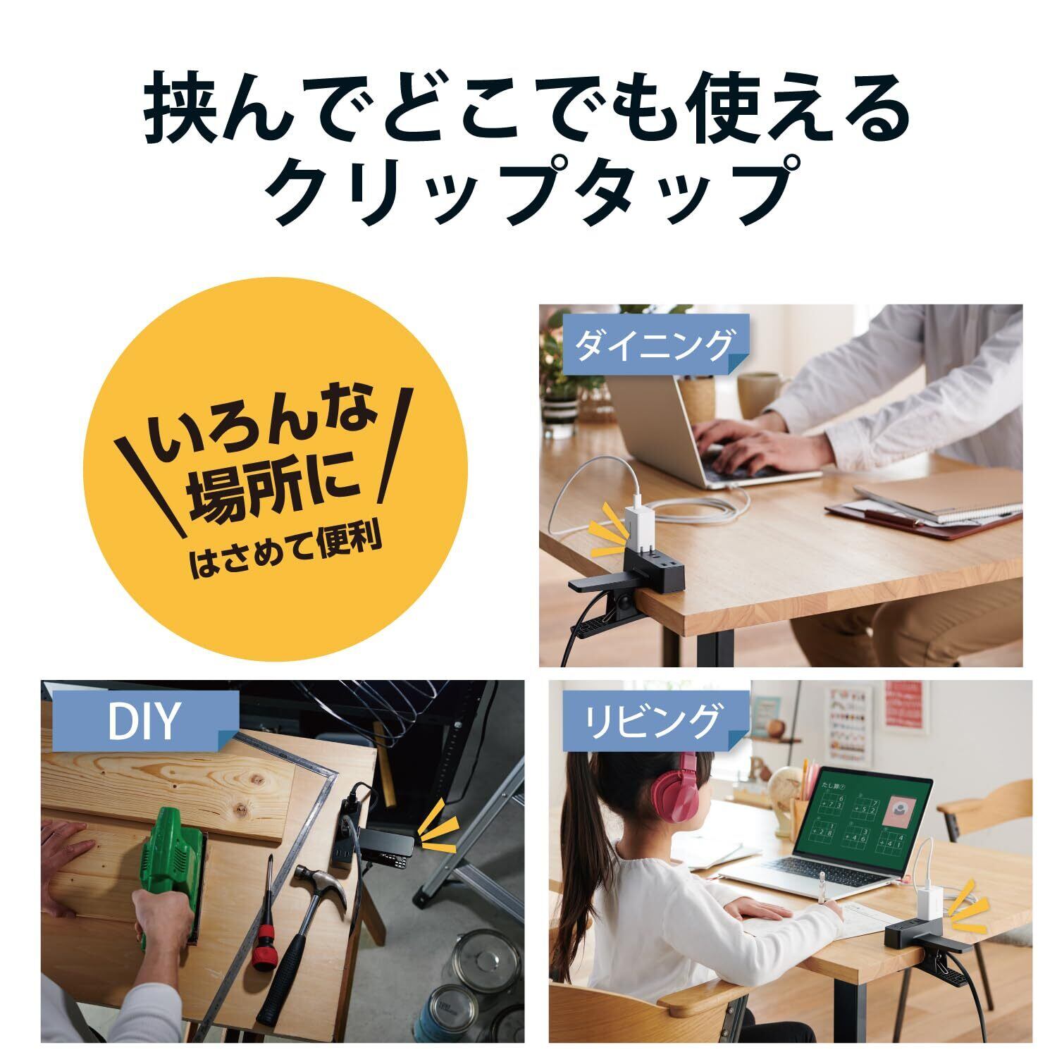 タップを常設できないダイニングテーブルなどでテレワークや宿題をする際に、一時的に設置して利用するのに便利です。