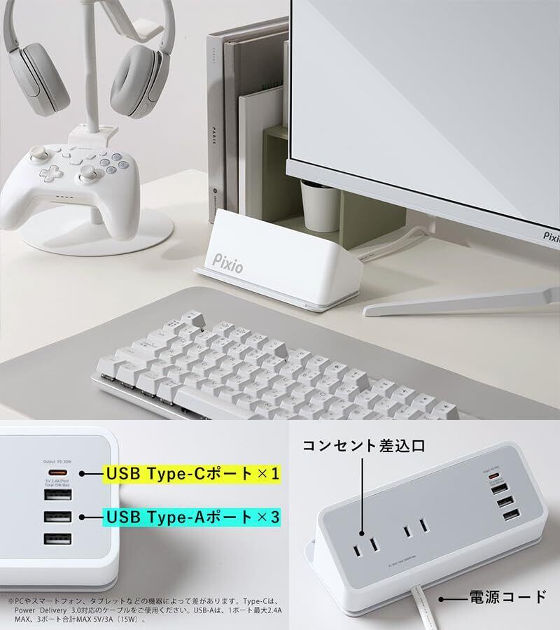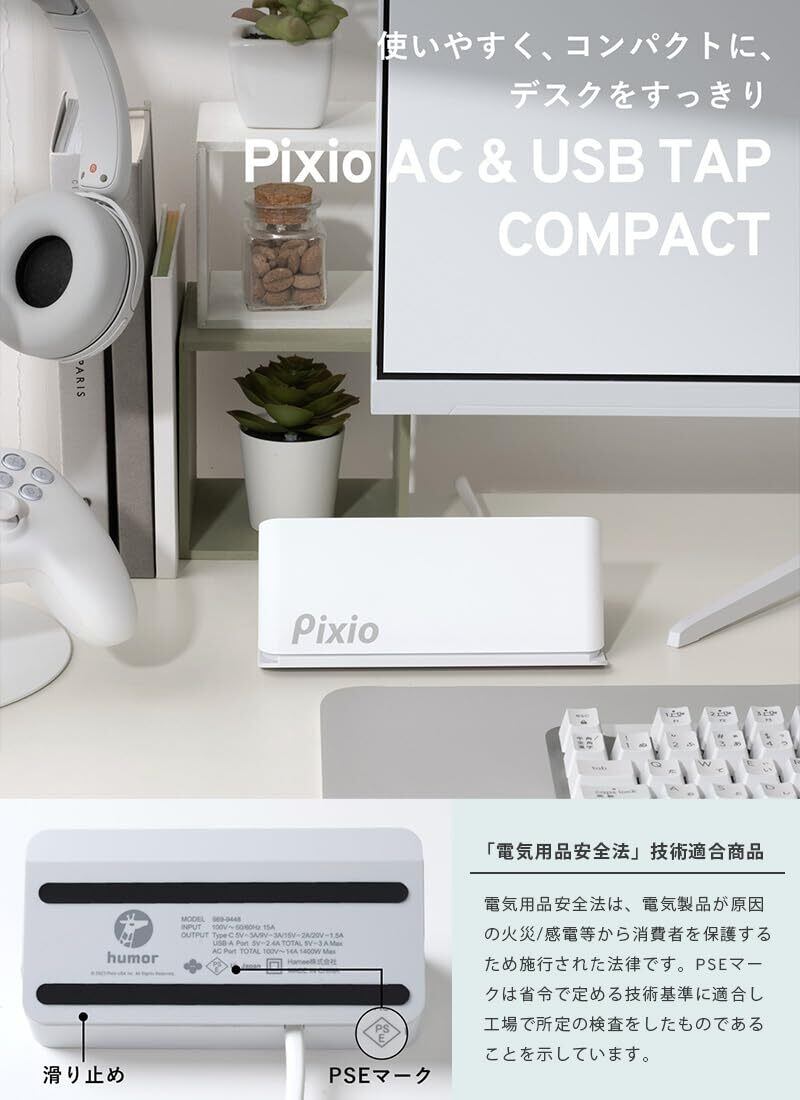 Pixio AC&USB TAP COMPACT White 電源タップ ホワイト 卓上 コンセント USB Type-C Type-A 充電ステーション ACアダプタ 急速充電 コンパクト スマホ スタンド機能 延長コード USB充電器 おしゃれ デスク インテリア ゲーミング