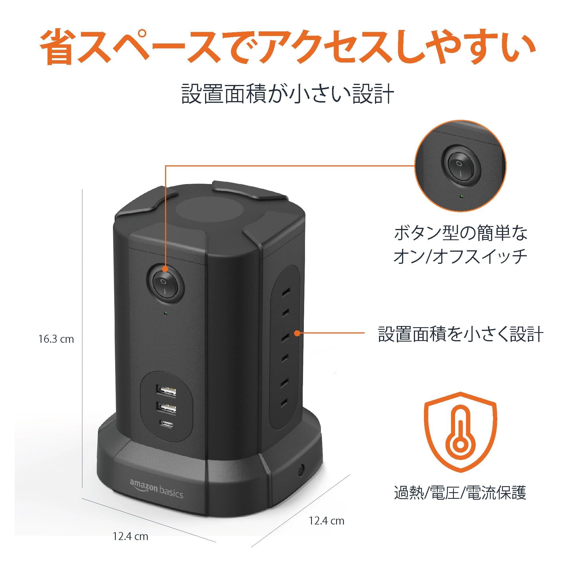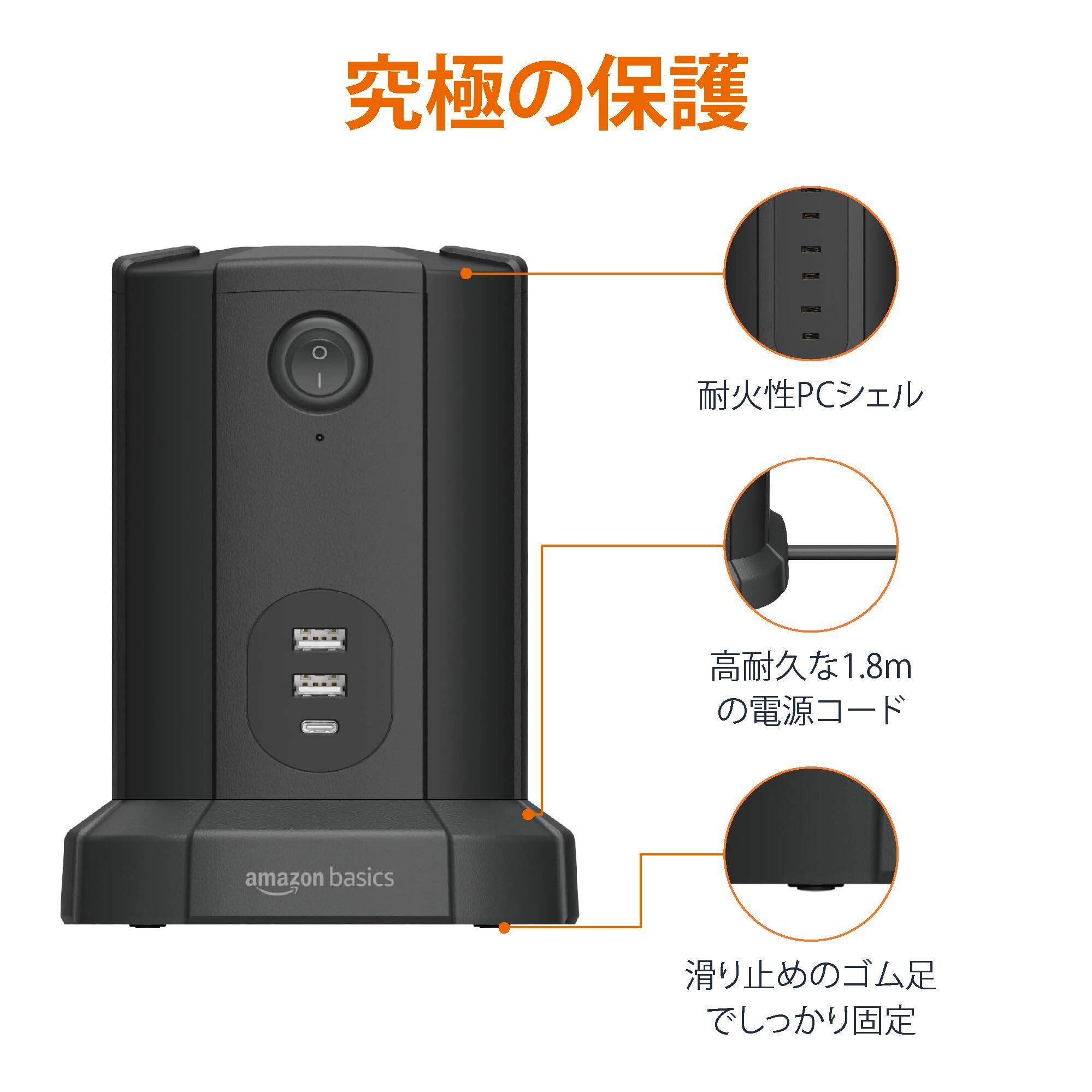 商品内容: ACコンセント9個、USB-Aポート2個(5V/3.4A Max)、USB-Cポート1個(5V/3A Max)の電源タップタワー1台