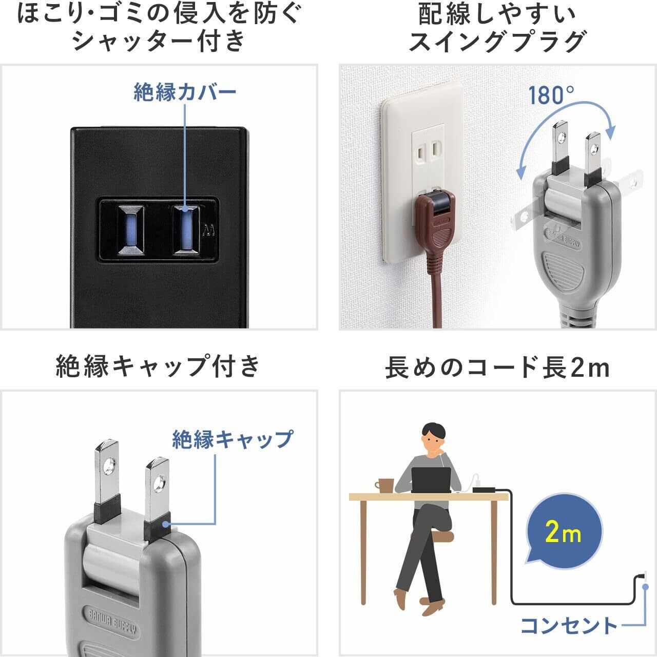 **サンワダイレクト 電源タップ 4個口 2m マグネット 雷ガード ほこり防止 スイングプラグ ブラック 700-TAP054-2BK**
