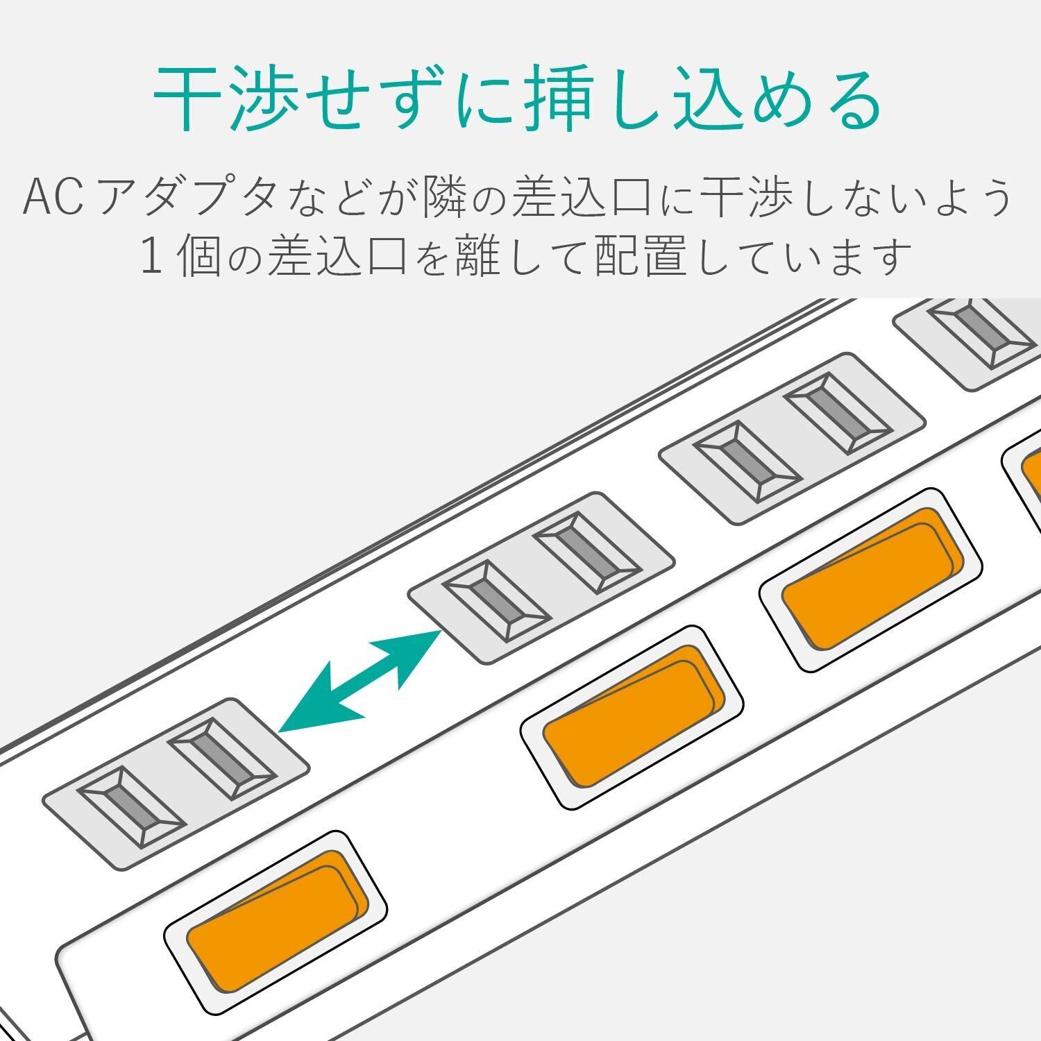 「各差込口には十分なスペースが確保されており、大型のACアダプタを使用しても干渉せず、快適に複数デバイスを同時接続できます!家庭やオフィスで大活躍です!」