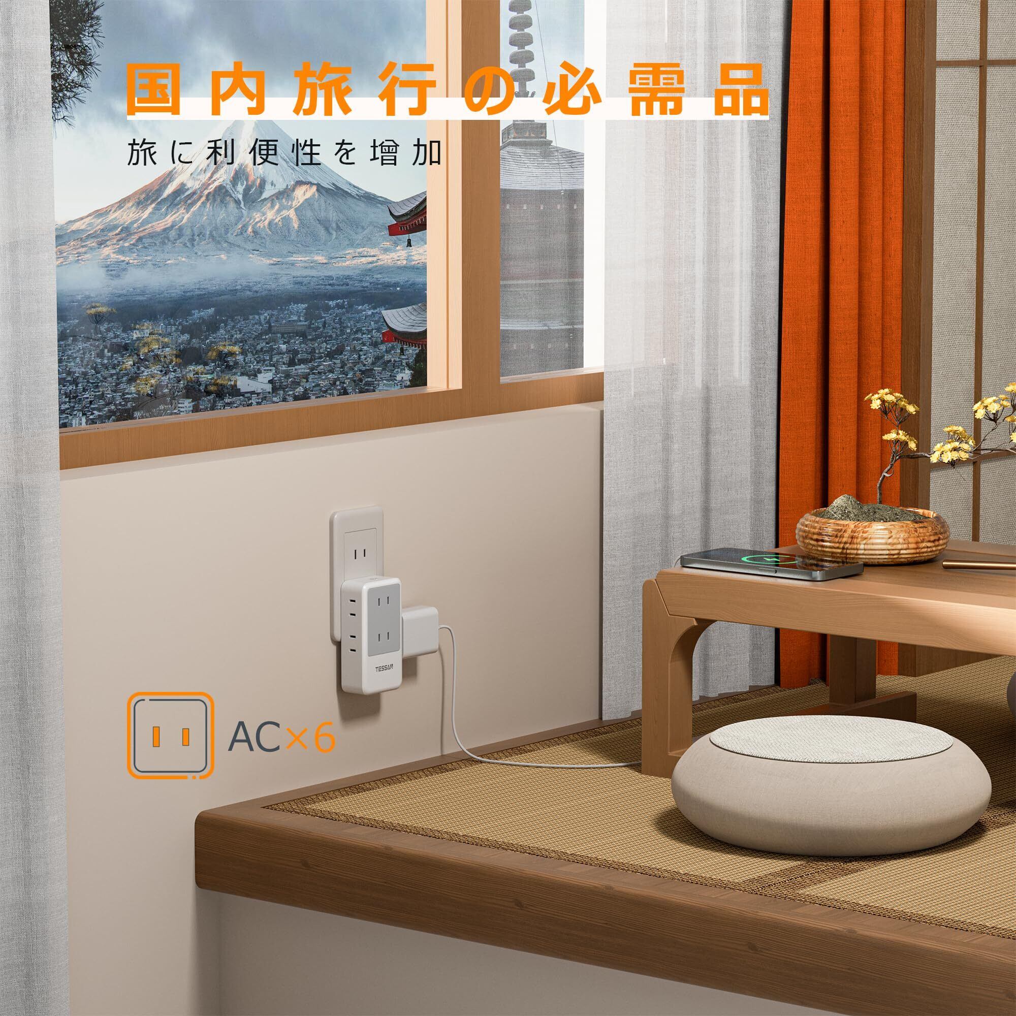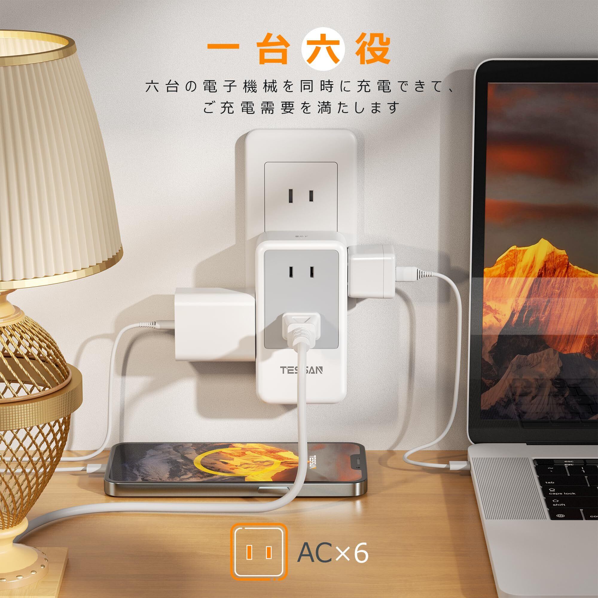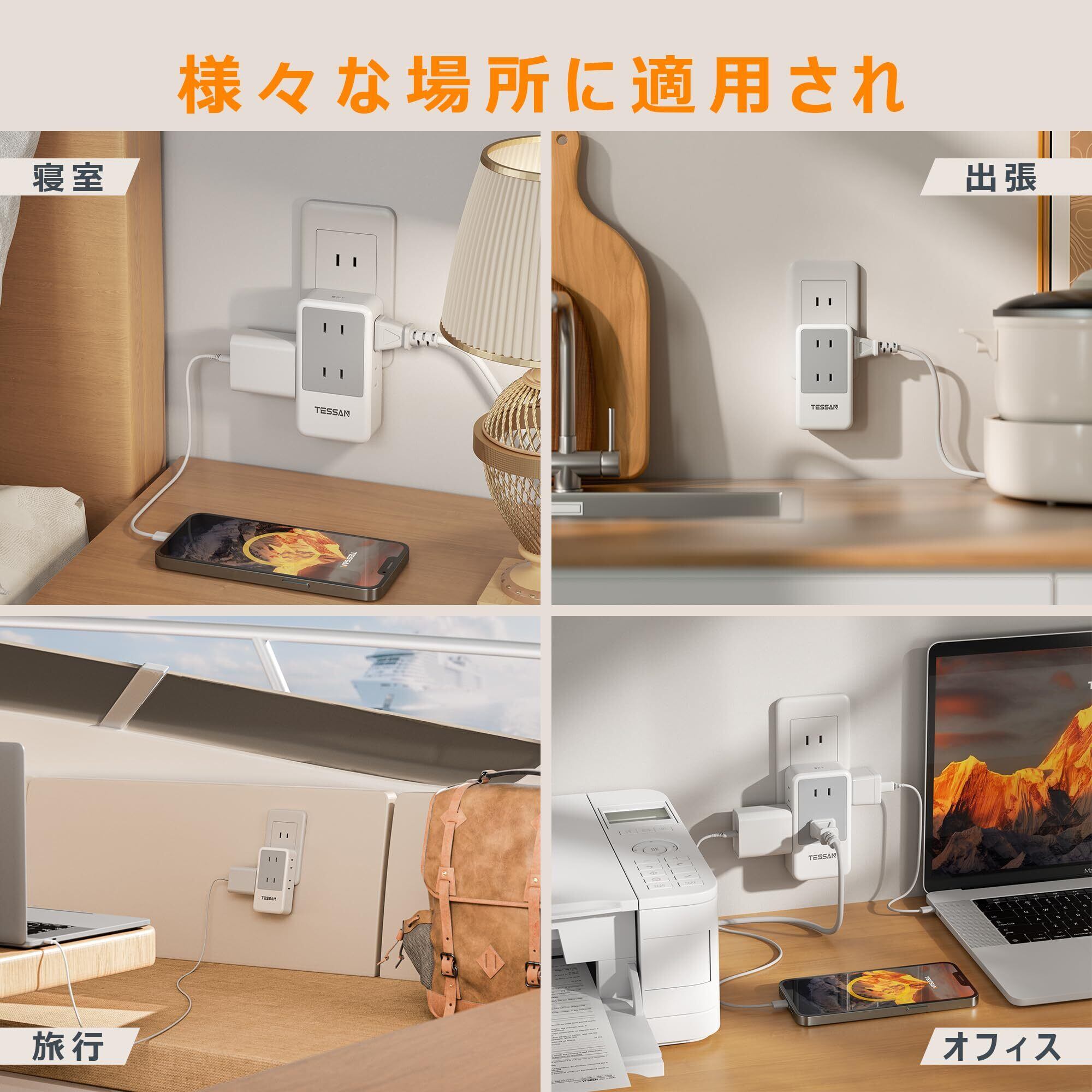 「この『TESSAN コンセントタップ』は、高性能とスタイリッシュなデザインが融合した便利な電源タップです!3つの方向からの接続が可能なデザインと、雷ガード機能を搭載し、安心してお使いいただけます。」