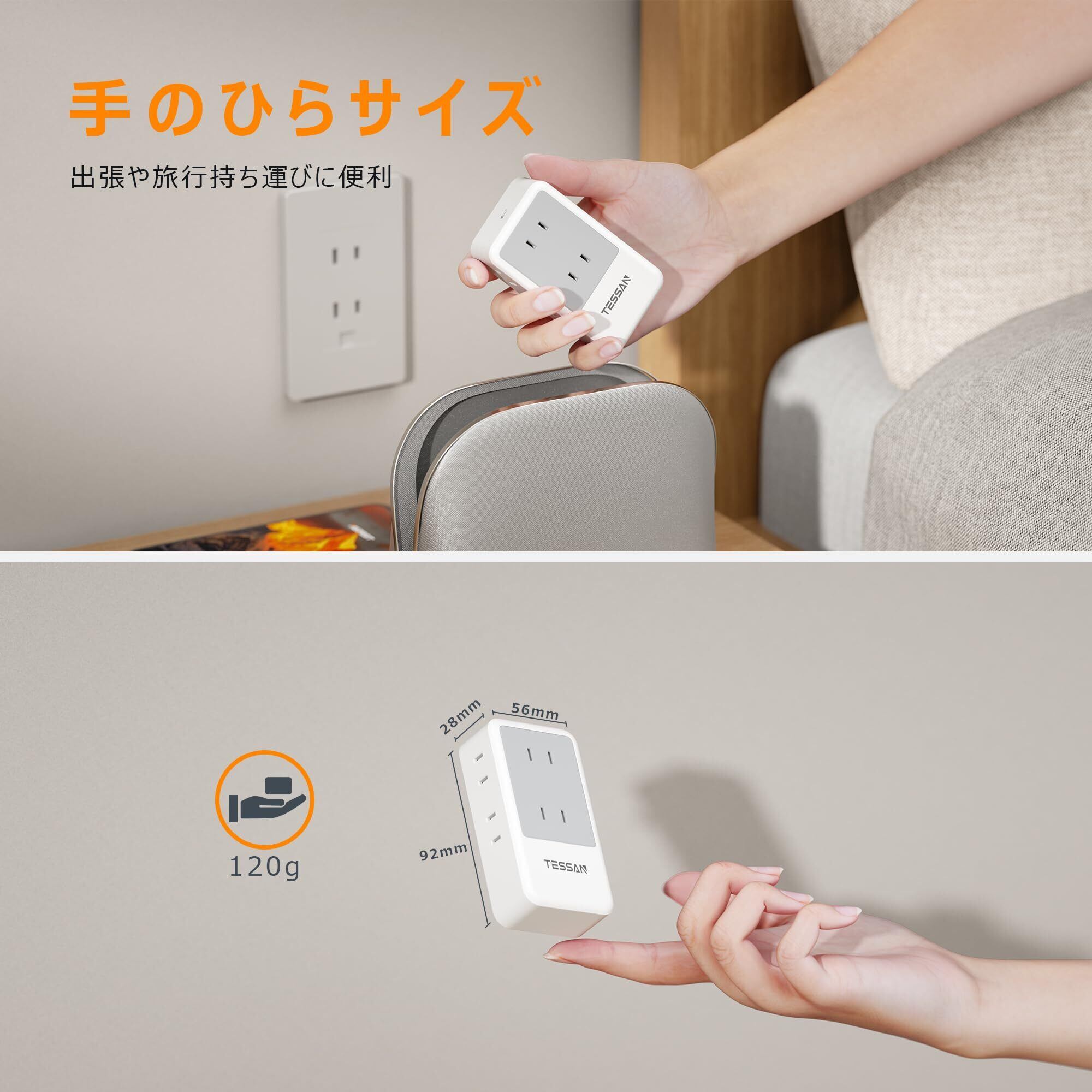 【小型・軽量増設用壁タップ】このコーナータップは手のひらサイズで持ち運びに便利です。軽量ABS樹脂94V0製で落下衝撃に強く、92×56×28mmの超小型サイズはスマホよりも小さくコンパクトです。自宅に狭いスペースでのご使用に最適、外出や出張にも最適です