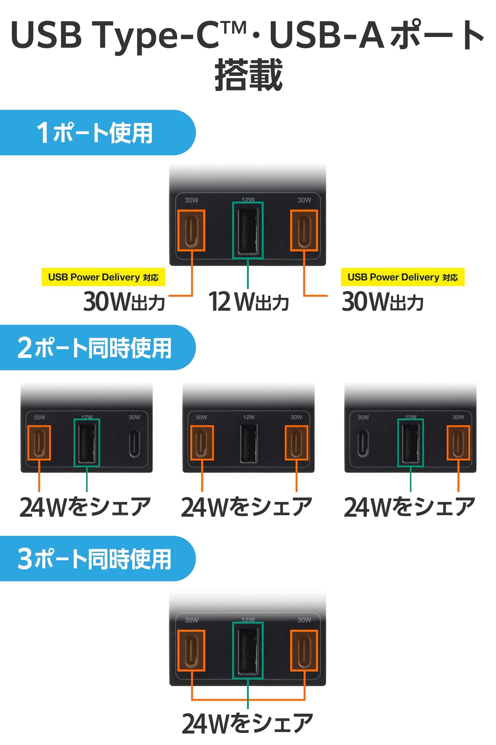 ■USB側定格出力:[1ポート使用時]USB Type-C1/C2ポート:30W(5V/3A、9V/3A、12V/2.5A、15V/2A、20V/1.5A)、PPS:30W(5V~11V/3A、5V~16V/2A)、USB-A1ポート:12W(5V/2.4A)