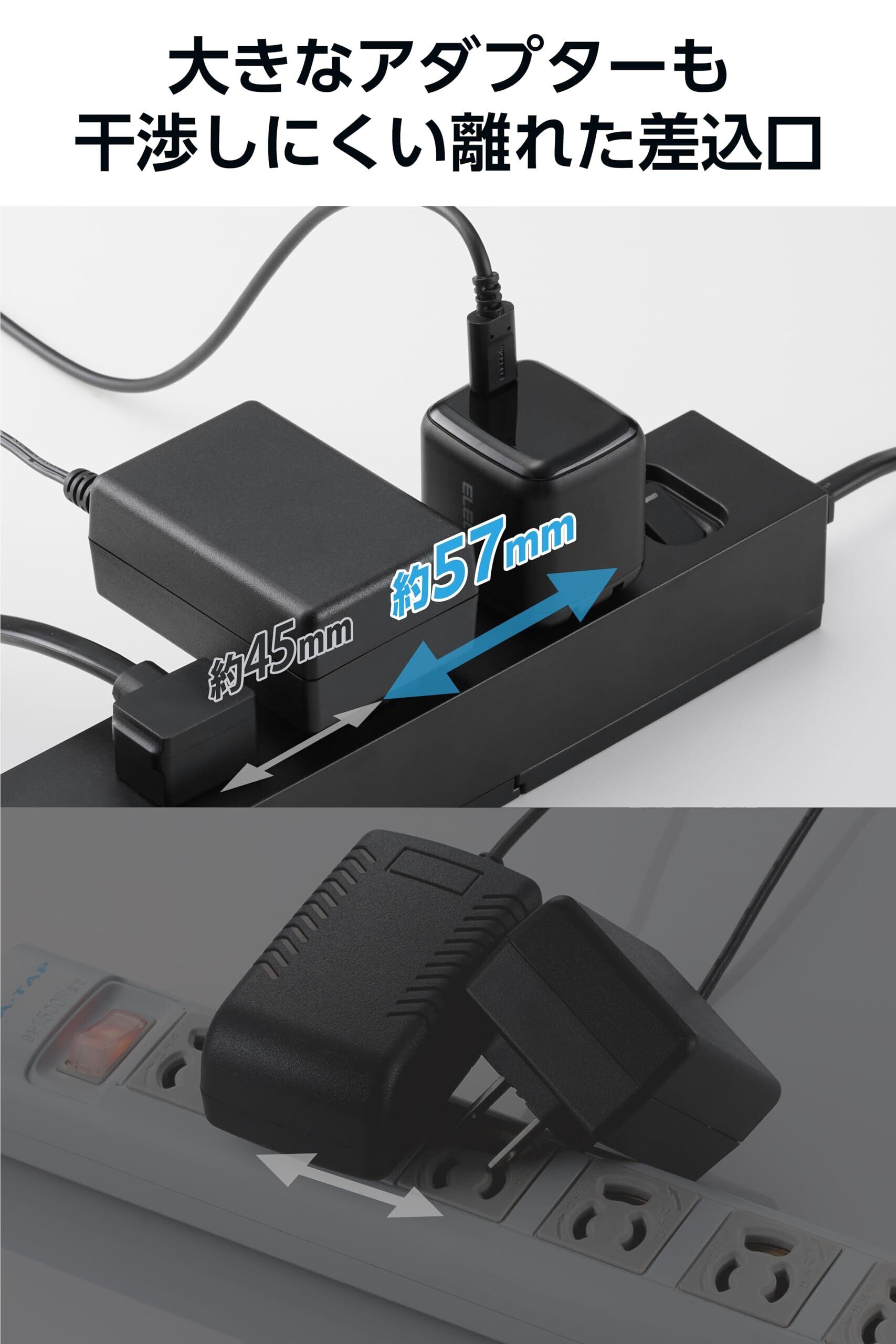 ■差込口の間隔は広いところが57mm、狭いところが45mmです。広い間隔で配置された差込口は、大きなアダプターを挿しても隣の差込口に干渉しにくくなっています。