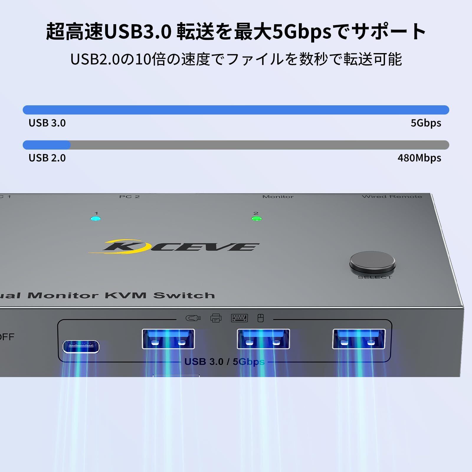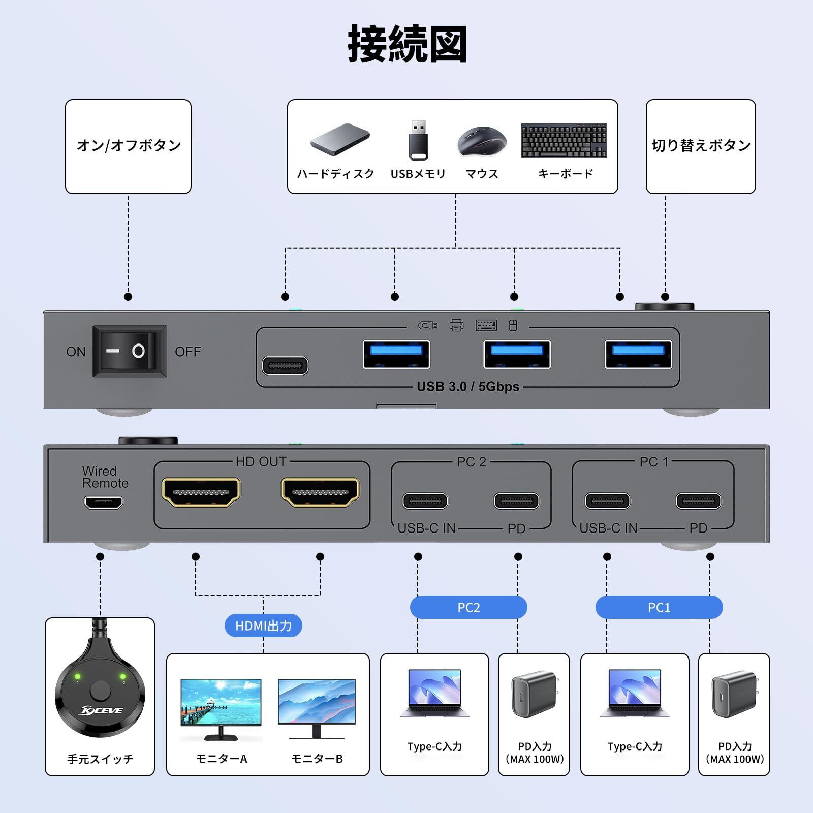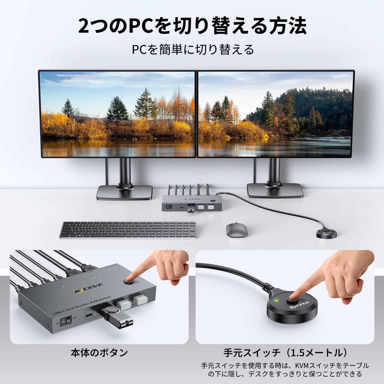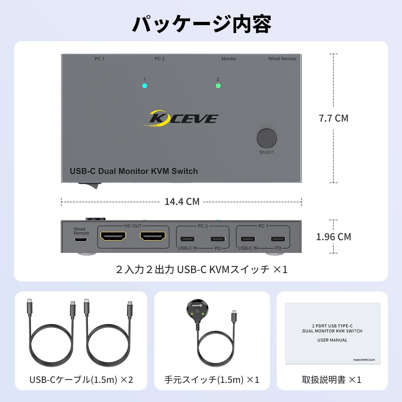 KCEVE デュアルモニター USB-C USB3.0 KVMスイッチ 2入力2出力 ノートPC用 4K@60Hz KVM切替器 Type-C 100W PD充電、パソコン切替器 2台 Type-C、2台のモニターと1組のキーボード マウスを共有できる、手元スイッチやUSB-Cケーブル付属