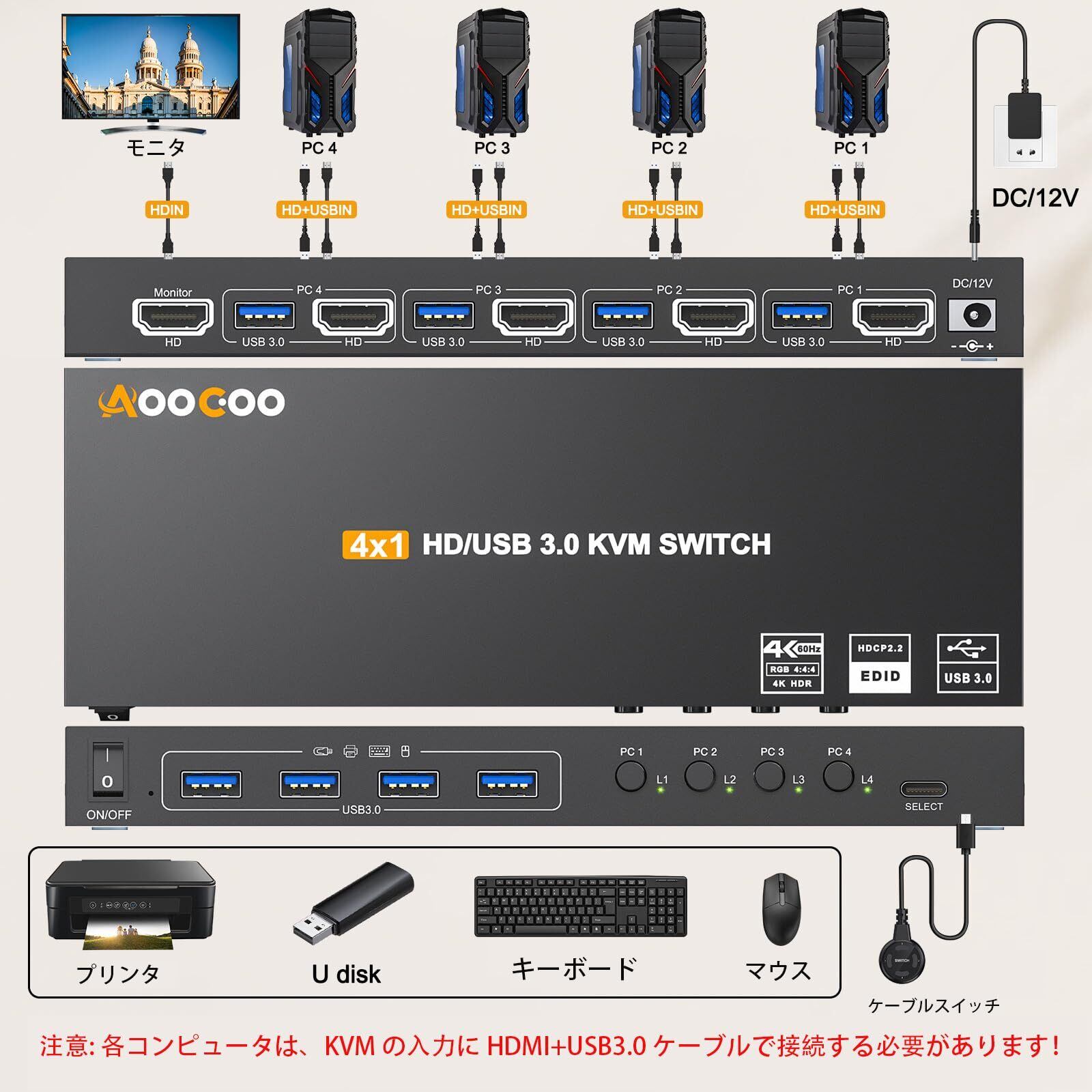 USB 3.0 KVM スイッチ HDMI 4 PC 4K@60Hz EDID 付き 4入力1出力、キーボード、マウス、プリンター、コントローラー用の4つのUSB 3.0ポート、USB3.0ケーブル、HDMIケーブル付属