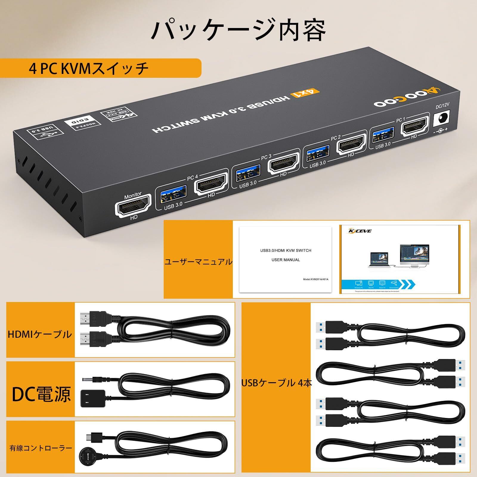 【パッケージ内容】AOOCOOは、この4K@60Hz HDMI USB 3.0 KVMスイッチに生涯テクニカルサポートを提供しています。パッケージ内容:USB 3.0 KVMスイッチ本体 x 1、USB 3.0ケーブル x 4(1.5m)、HDMI2.0ケーブル x 1(1.5m)、有線リモコン x 1、ユーザーマニュアル x 1。