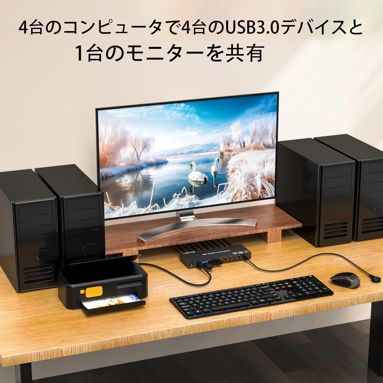 「この『USB 3.0 KVM スイッチ』は、4台のPCを1つのモニターで操作できる極めて便利なアイテムです!4K@60Hzの高解像度に対応しており、デジタルコンテンツを鮮明に楽しめます。USB 3.0ポートを利用することで、キーボードやマウス、プリンター、コントローラーの接続も一貫して行え、作業効率を大幅に向上させます。」