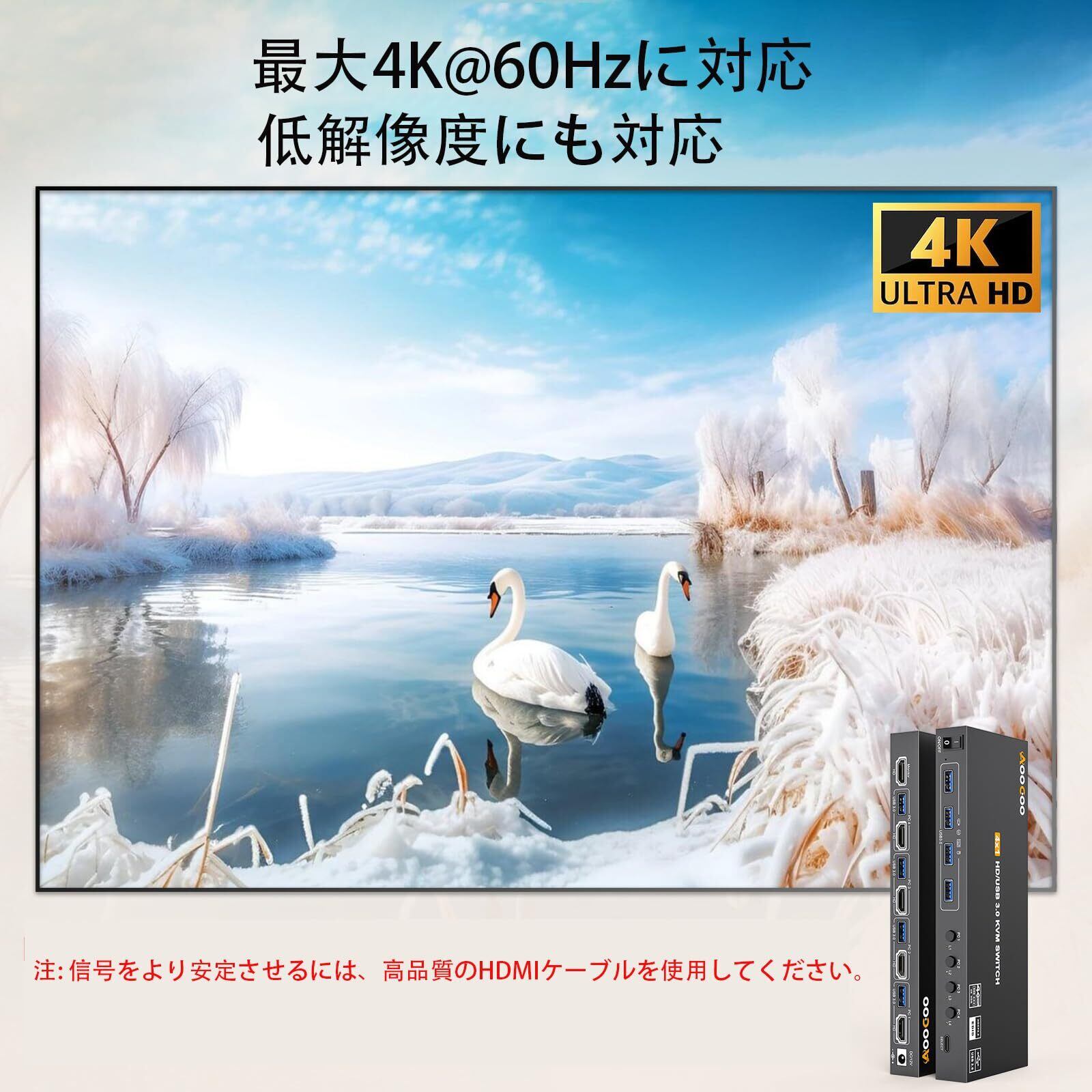 【Ultra HD 4K@60Hzの映像体験】USB 3.0 HDMI KVMスイッチは、4K@60Hz、2K@120Hzに対応しており、より繊細で鮮明な画像を表示し、非常にクリアな画像とより鮮やかで動きのある色彩を実現します。もちろん、4K@30Hz、3D、1080P以下の解像度にも対応しています。コンピューターとディスプレイが4K解像度に対応していることをご確認の上、HDMI 2.0ケーブルをご使用ください。