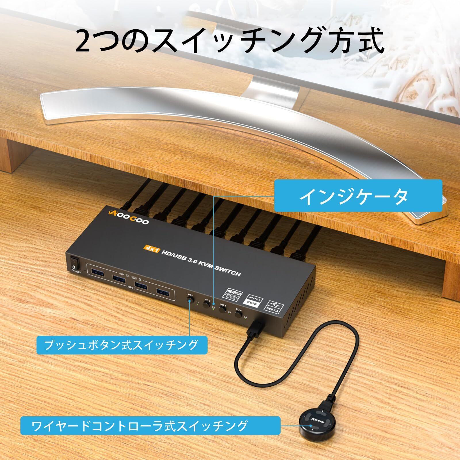 【2つの切り替えモード】KVM USB 3.0スイッチを使用すると、付属の有線リモコン、または本体のボタンで4台のコンピューターを切り替えることができます。▶▶新しいデバイスの電源が投入されると自動的に切り替えが行われ、緑色のLEDが対応するコンピューターを示します。有線コントローラーのパネルに数字が表示されており、1を押すとPC1に切り替わります。