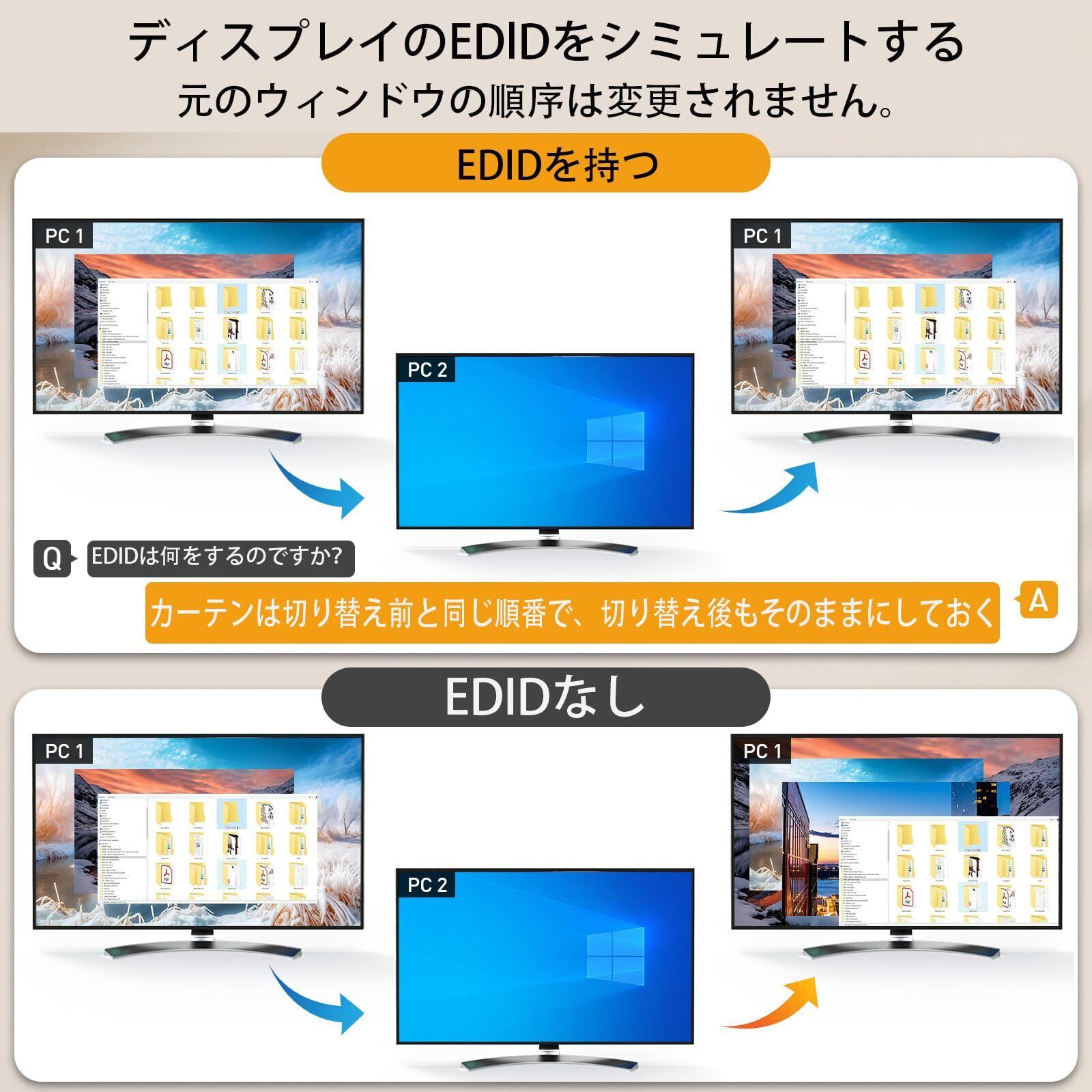 【EDID対応】このHDMI KVMスイッチは、ディスプレイのEDIDをシミュレートし、ディスプレイの解像度とリフレッシュレートを保存します。例えば、PC1からPC2に切り替え、その後PC2からPC1に戻すと、PC1のウィンドウは切り替え前の順序を維持し、並べ替えられることはありません。さらに、EDID機能により最適な解像度を自動で検出します。