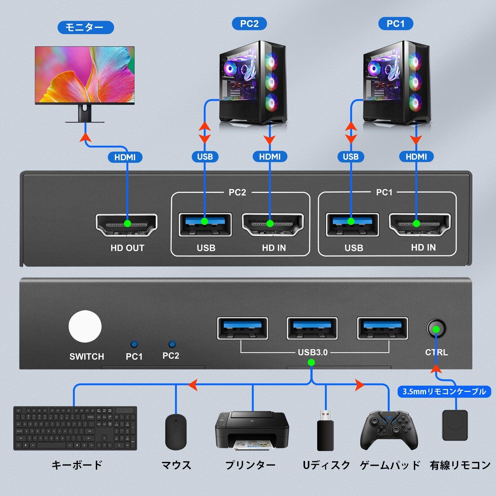 **USB3.0 KVMスイッチ 2台のPCを1台のモニターに接続 4K@60Hz HDMI KVM切替器 2入力1出力 ボタン&有線リモコン切り替え対応**