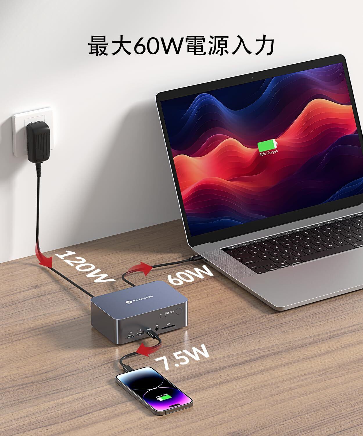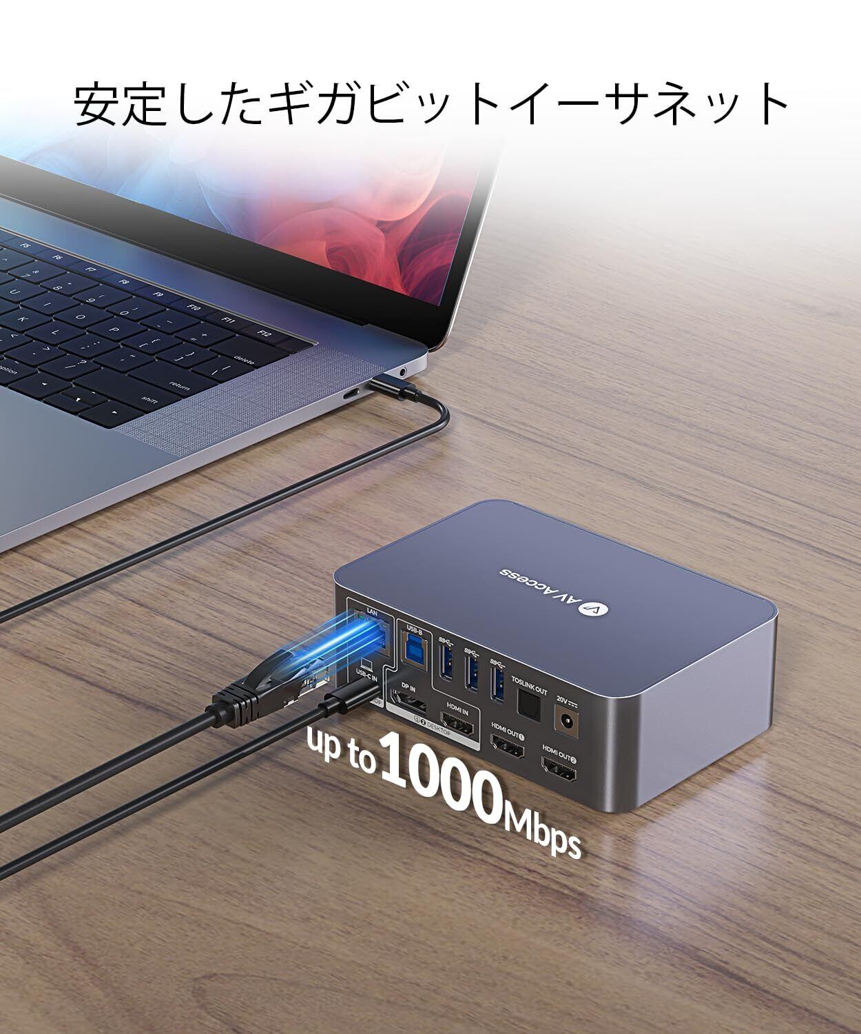 AV Access KVM スイッチ 2 モニター イーサネット付きコンピュータ 2 台、EDID、4K@60Hz/2K@144Hz/1080P@240Hz、KVM ドッキング ステーション、ラップトップ & デスクトップ用デュアル モニター、USB-C 充電、アルミニウム、3xUSB 3.0、電源