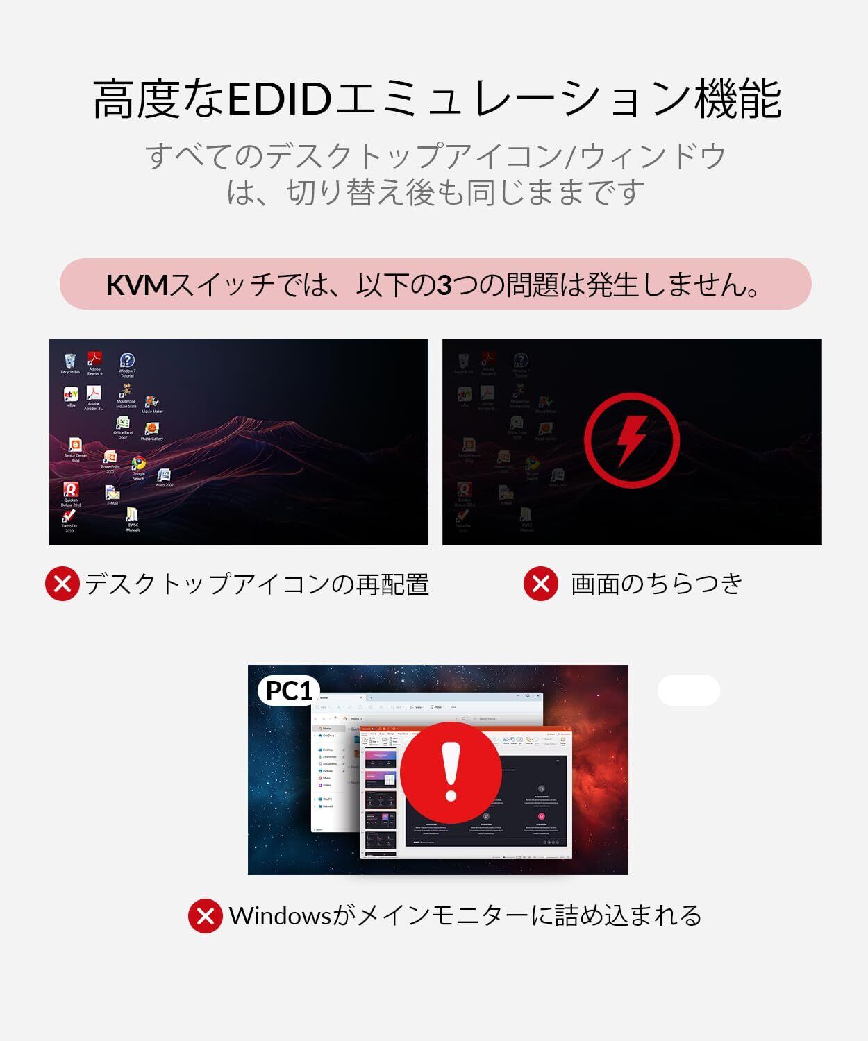 「2台のコンピュータを1つのキーボードとマウスで効率良く切り替えることができ、業務や趣味を問わず、幅広い用途で活躍します。EDID機能によって、最適な解像度とリフレッシュレートを自動的に設定するため、面倒な設定は必要ありません。」