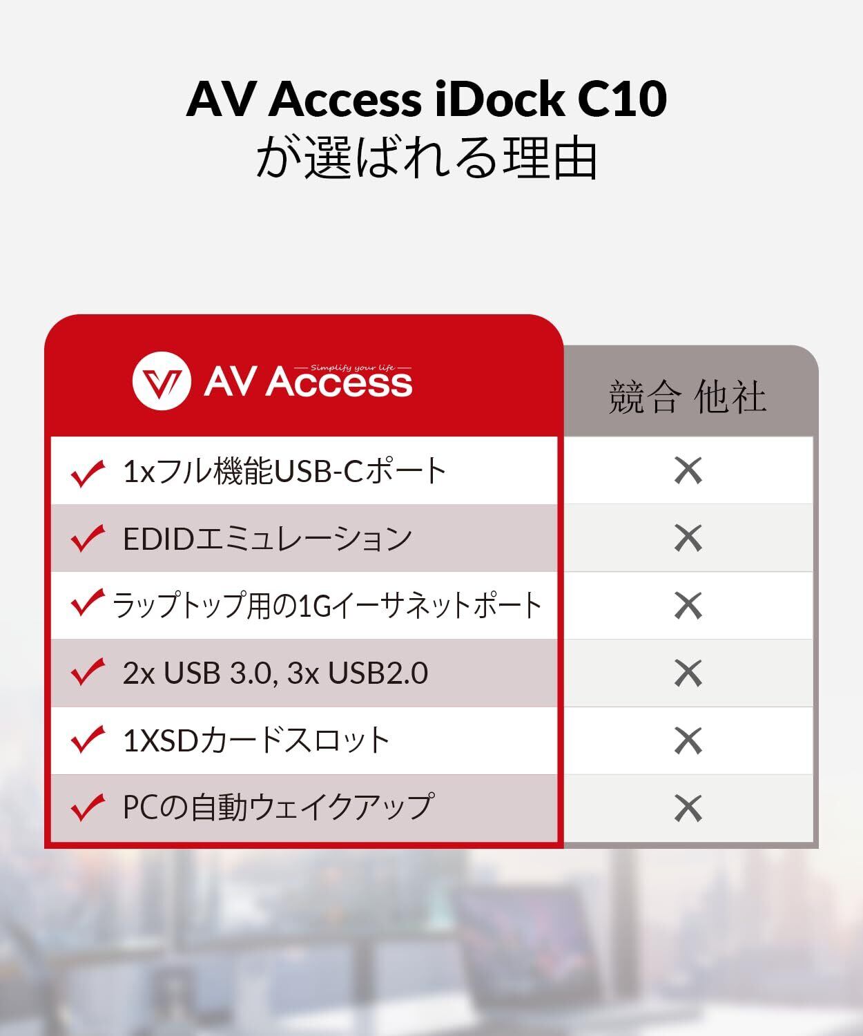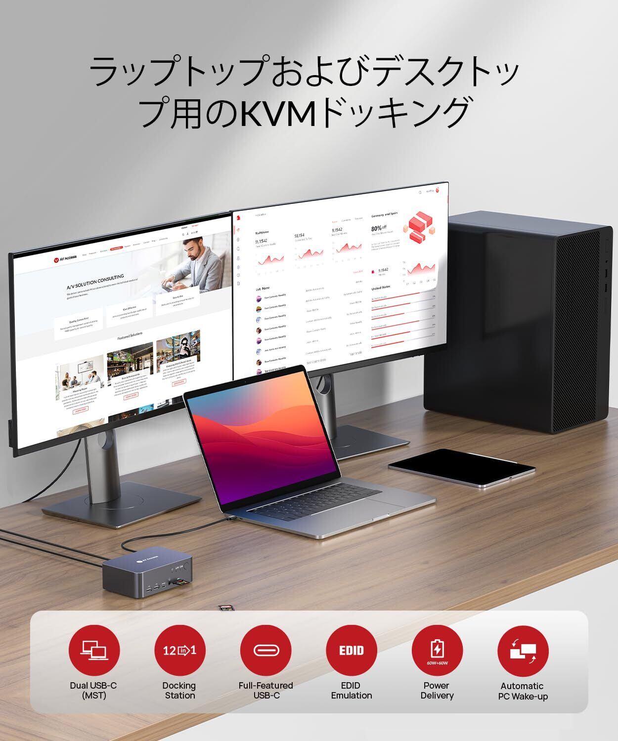 「この『AV Access KVM スイッチ』は、2台のコンピュータを2つのモニターで同時に操作できる優れたデバイスです!最大4K@60Hzの高解像度に対応しており、鮮やかなビジュアルが体験できます。USB-C充電機能付きで、ラップトップやデスクトップの両方に対応し、利便性を追求した設計になっています。」