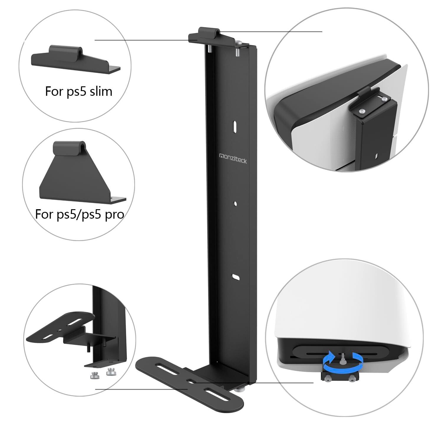 Monzlteck PS5スリム用ウォールマウント - PS5オリジナルおよびPS5スリム(デジタルおよびディスク)用スチールマウントウォールホルダーブラケット 頑丈で落下しない、+ コントローラーホルダー1つ。, ブラック