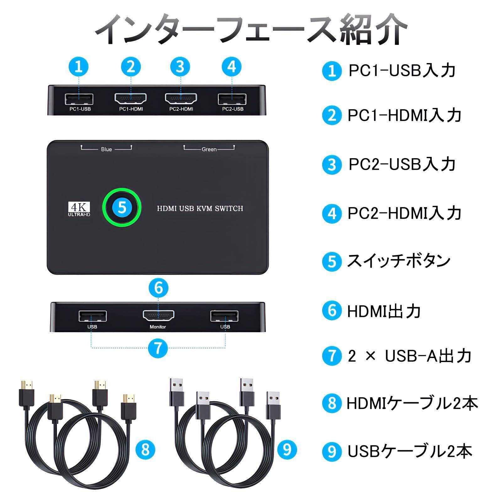 【機能】4K@60Hz映像出力に対応、最大でUSB機器3台をボタンを切り替えることで、PC2台から操作可能な機能、接続されている機器が色でわかる接続ポート点灯仕様、USB2.0ポート仕様、ドライバーインストール不要、挿しこむだけですぐに使用できるプラグアンドプレイ仕様