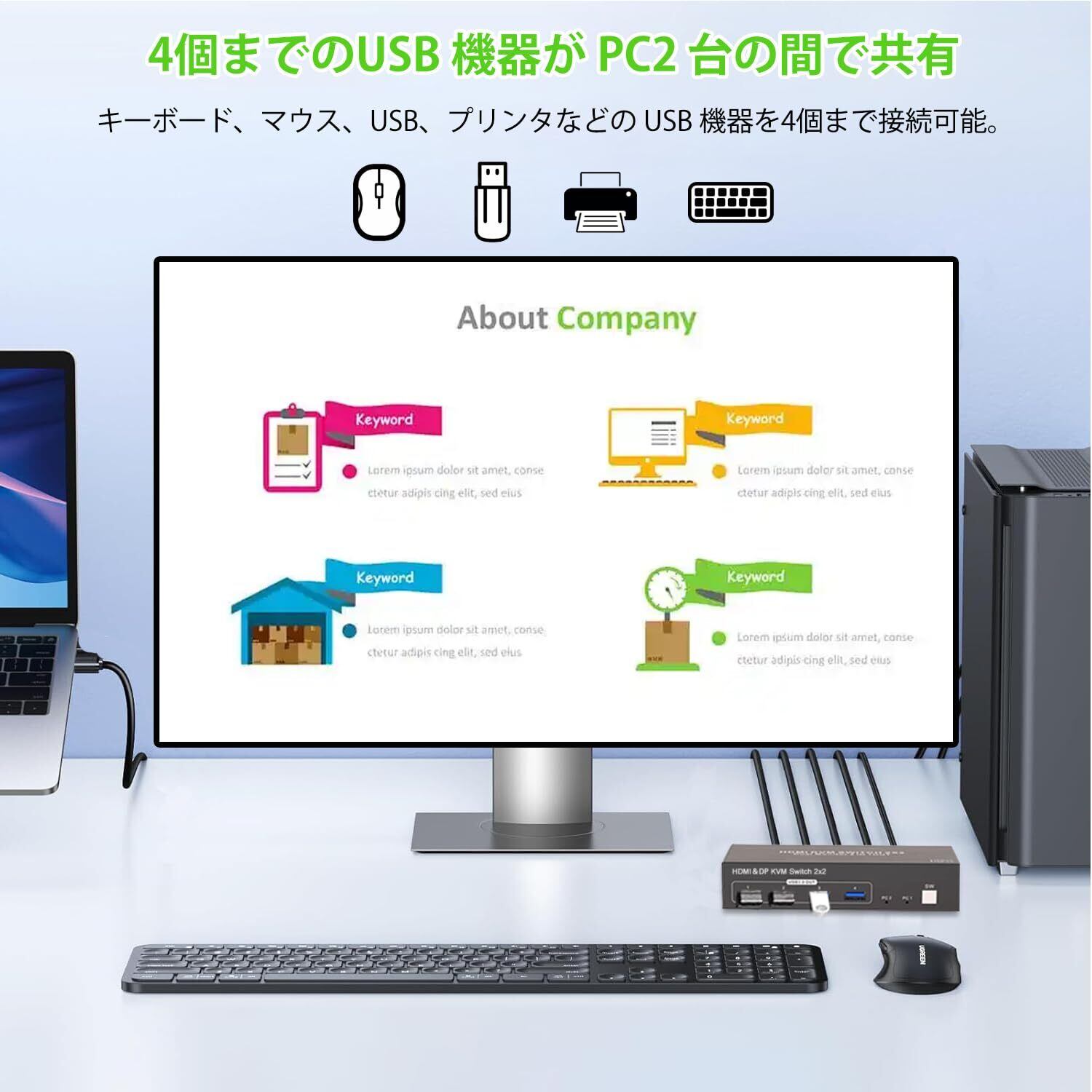 「USB3.0ポートが付いているため、キーボードやマウス、プリンター、スキャナーなどのUSBデバイスを共有できます。手元で簡単に接続と切替ができ、作業効率が大幅に改善されます。」