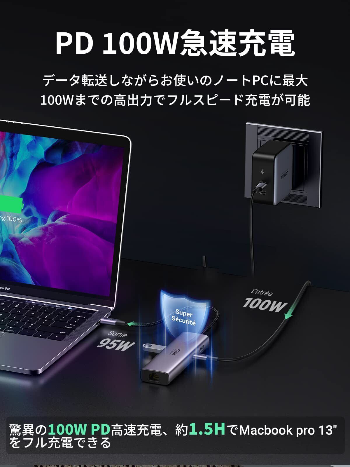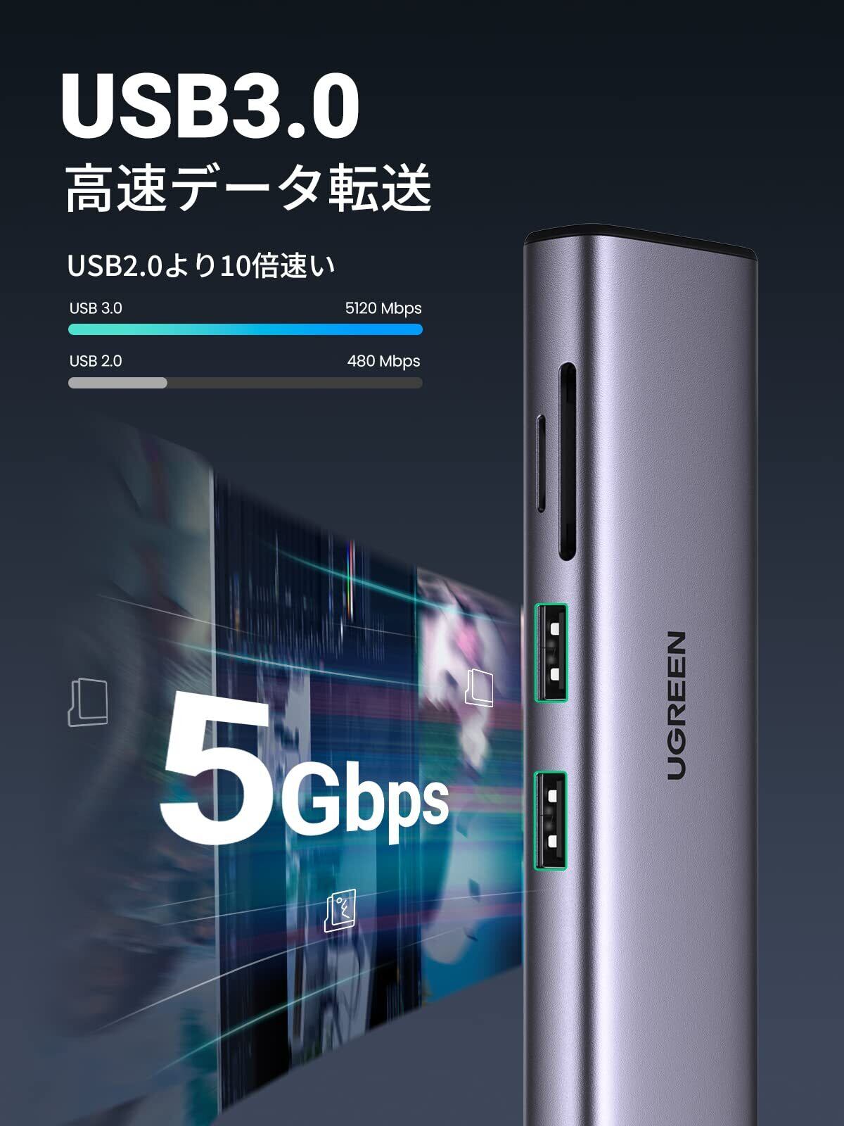 【100W PD急速充電&5Gbpsデータ転送】Type-Cコネクタを経由してパソコン等デバイス本体に最大100Wの高速充電が可能なPower Delivery(PD)ポートを搭載。【ご注意】高電力デバイスを駆動する必要があるため、100Wの充電器と100W充電ケーブルを使用する必要があります。2×USB 3.0ポートを備え、最大5Gbpsのデータ転送速度を実現して、数秒以内にHD映画を転送することが可能です。ハードドライブ、プリンター、マウス、その他のUSBデバイスをノートパソコンに接続できます。