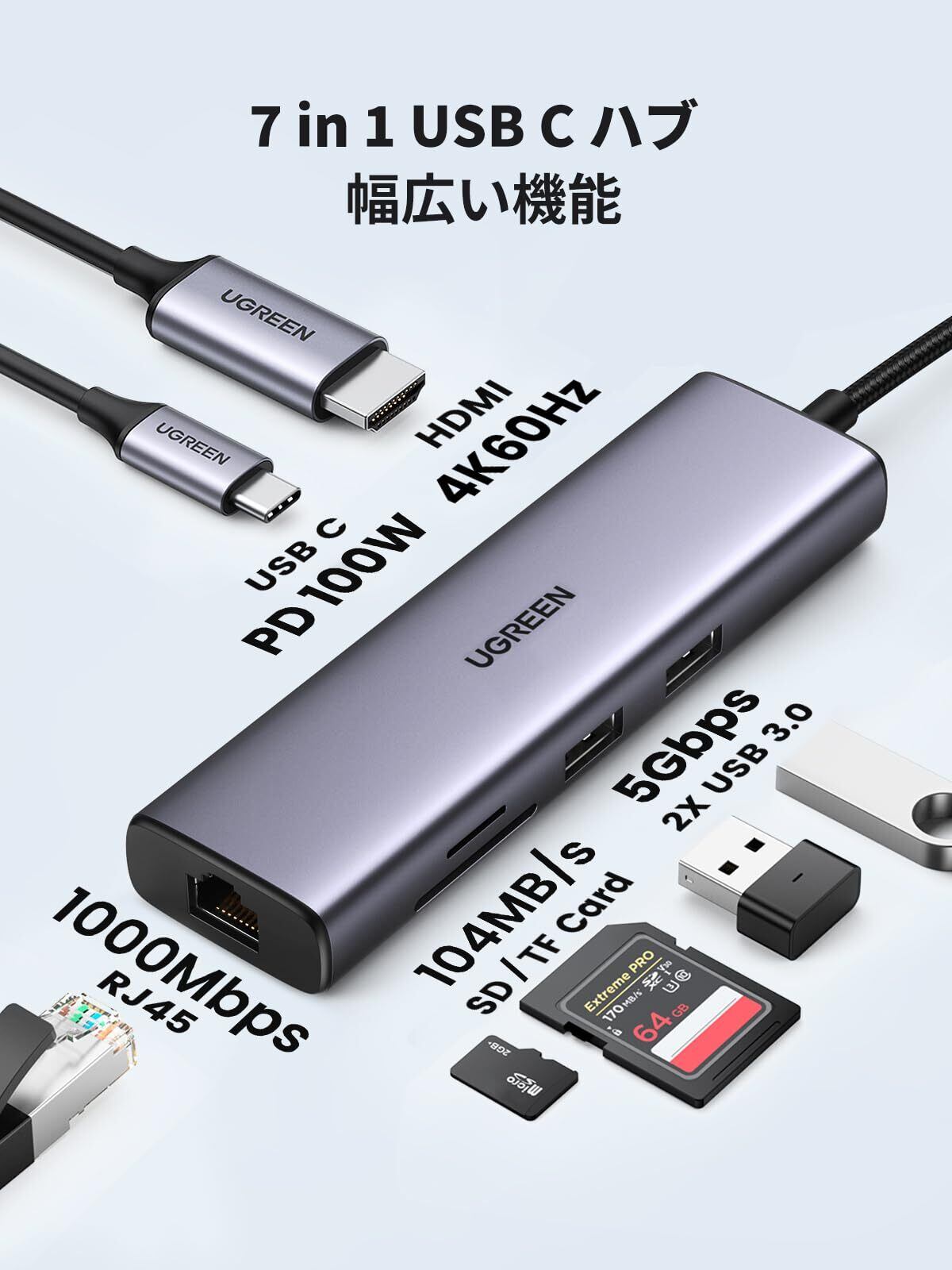 UGREEN Revodok 107 USB Cハブ 7-IN-1 USB3.0ハブ 4K@60Hz HDMI出力 100W PD急速充電 Type-Cアダプター 2*USB 3.0ポート 4K HDMI 100W Power Delivery ギガビットイーサネット LAN ポート SD/MicroSDカードリーダー Surface Dell MacBook Air M1 M2対応