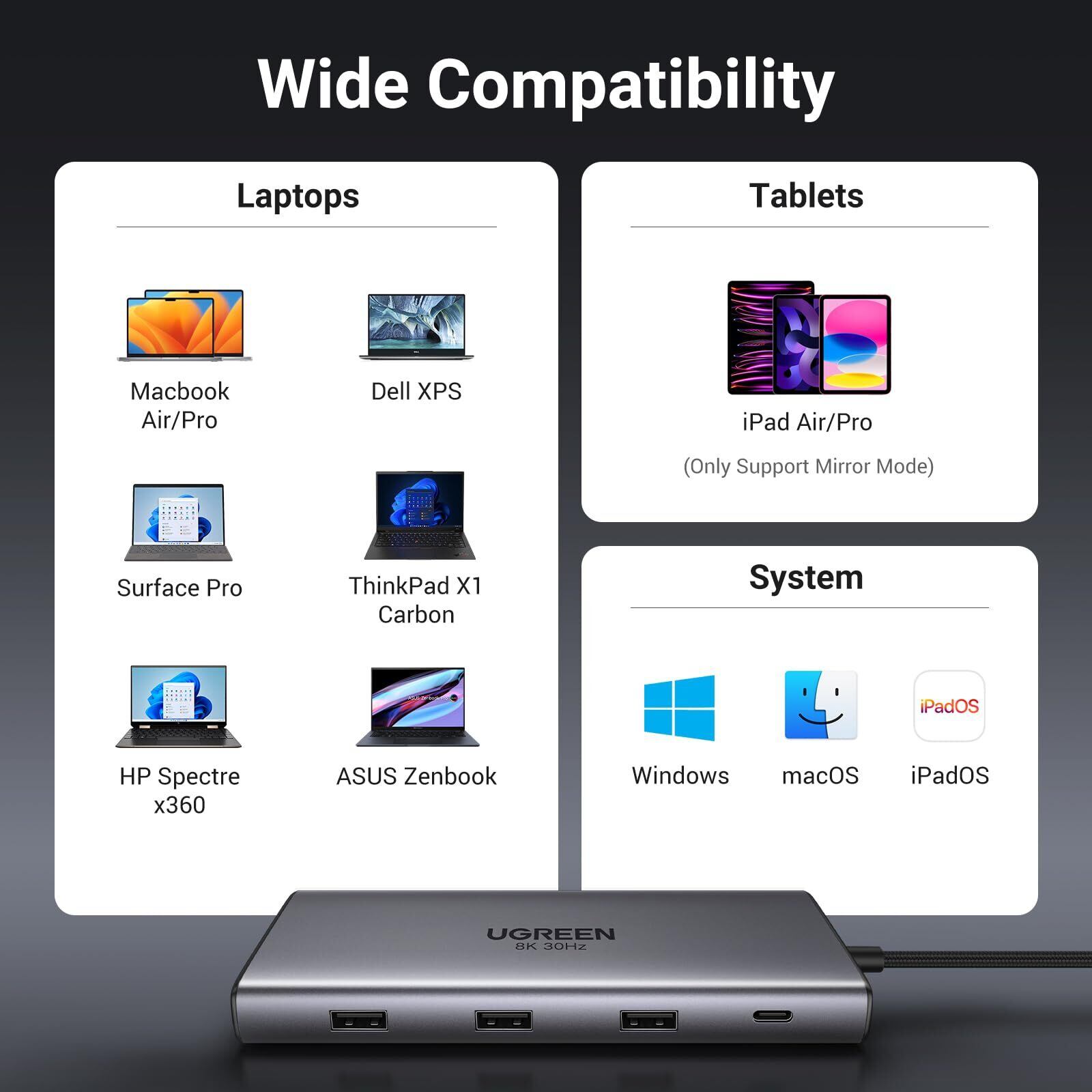 「この『UGREEN Revodok Pro 210 10 in 1 USB-Cドッキングステーション』は、あなたのデジタル環境を革新する必須アイテムです!多彩なポートを持つこのハブは、デバイスを簡単に接続し、快適な作業環境を整えます。特に、二つのHDMIポートを使って4K@60Hzの高画質映像を同時に出力し、一つのHDMIポートでは8K@30Hzに対応するため、驚きの視覚体験を提供します。」