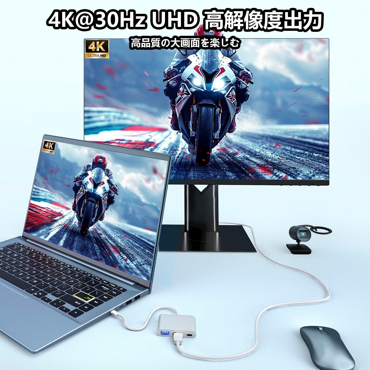 **USB C HDMI アダプタ 3in1-4K@30Hz解像度出力 / 100W PD急速充電 / USB3.0高速転送**