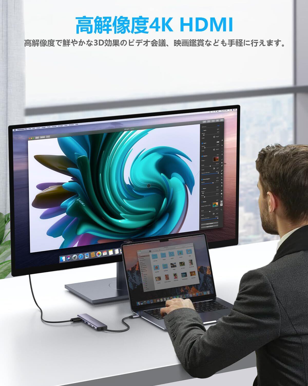 「HDMIポートは最大4K@30Hzの高解像度映像出力に対応しており、映画やプレゼンテーションなどをクリアで鮮明な画質で楽しめます。作業環境を一新するための理想的な選択です!」