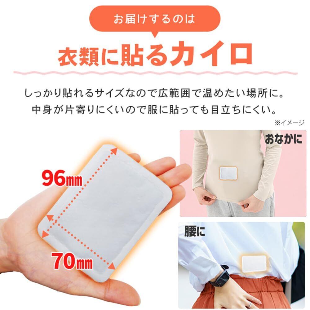 「ミニサイズのカイロは、貼り付けやすく、衣服の下でも目立たずに温まることができます。手先や足元、お腹など、必要な場所に簡単に貼って使用することで、必要なだけの暖かさを得られます!」