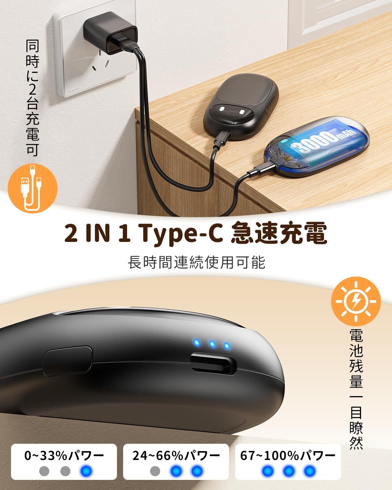 【2台同時充電可能・6000mAh大容量】付属の2 in 1ケーブルで2個同時に充電可能!2つで6000mAhの電池容量がありますので長時間の使用にも耐え、低温モードで7-12時間、中温モードで5-8時間、高温モードで4-7時間。(2つカイロの使用時間総合です。実際の使用時間は、環境や使用状況などにより異なる場合があります。)