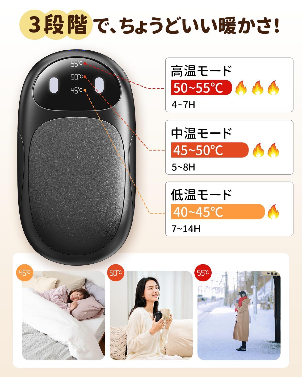 「3段階の温度設定により、自分に合った快適な温かさを選べます。寒さが厳しい日や、少し肌寒い日、どんなシーンでもあなたの快適をサポートします。」