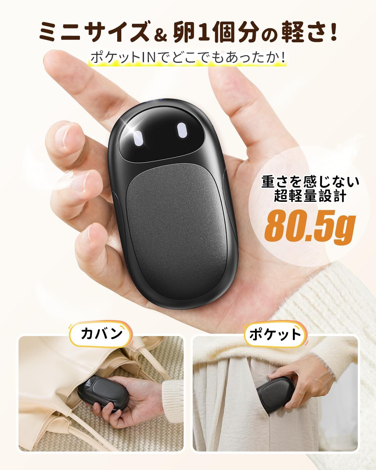 【超軽量・コンパクト・携帯便利】HAGOOGI電気カイロは95×52×20mmの手のひらサイズ。握りやすさを追求した薄型デザインで、ポケットやバッグにすっきり収まります。小さなお子様や女性でも使いやすく、指先までしっかり温めます。寒い朝の通勤や通学、厳寒地、屋外、学校、キャンプ、雪山、登山、野外ライブ、釣り、スキー、スノボ、雪遊びなど、寒い日の外出のお守り代わりに活躍します。冬の外出を快適にする頼れるアイテムです。