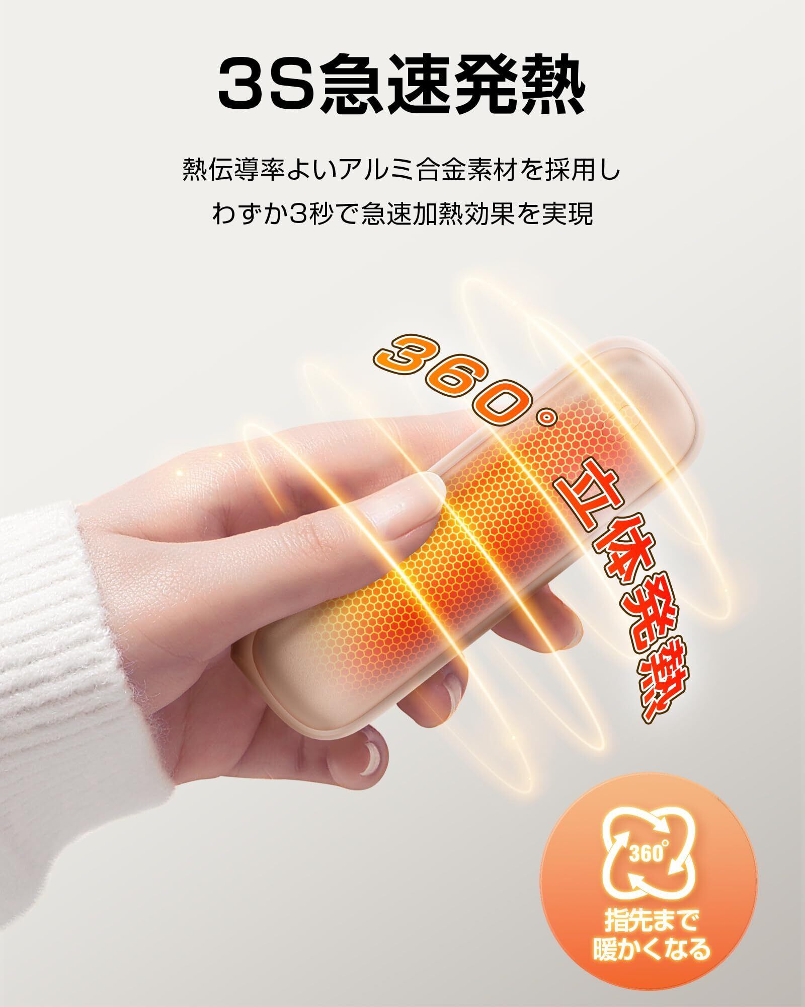 「10000mAhの大容量バッテリーを内蔵しており、最長で約23時間の連続使用が可能です。通勤やアウトドアでの使用にも最適で、急いでいる時はボタン一つでわずか2秒で暖まります。寒い外出の必需品です!」