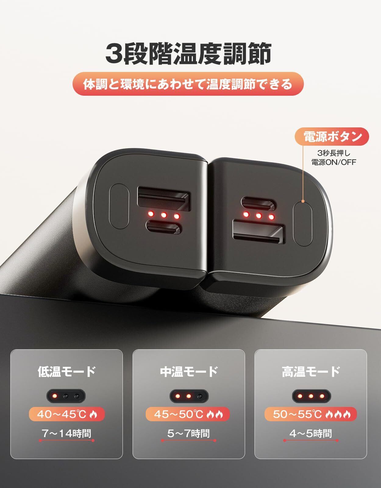 【3段階温度調節】充電式カイロは使い捨てカイロと違い、さまざまなシーンで使い分けたい人には、好みの温度に調節できます。低温(40~45℃)、中温(45~50℃)、高温(50~55℃)三段階調節可能で、机に座って作業するときは低めの45℃、通勤・通学時は中温の50℃、または特に冷え込む環境で高めの55℃に設定するなど、常に快適な温度であたたまれます。【使用時間】低温モード:約7~14時間、中温モード:約5~7時間、高温モード:約4~6時間です(2個のカイロ使用する総合時間です)(ご注意:低温火傷を防ぐため、電気カイロが高温モードで同じ場所に長時間使用しないでください。)