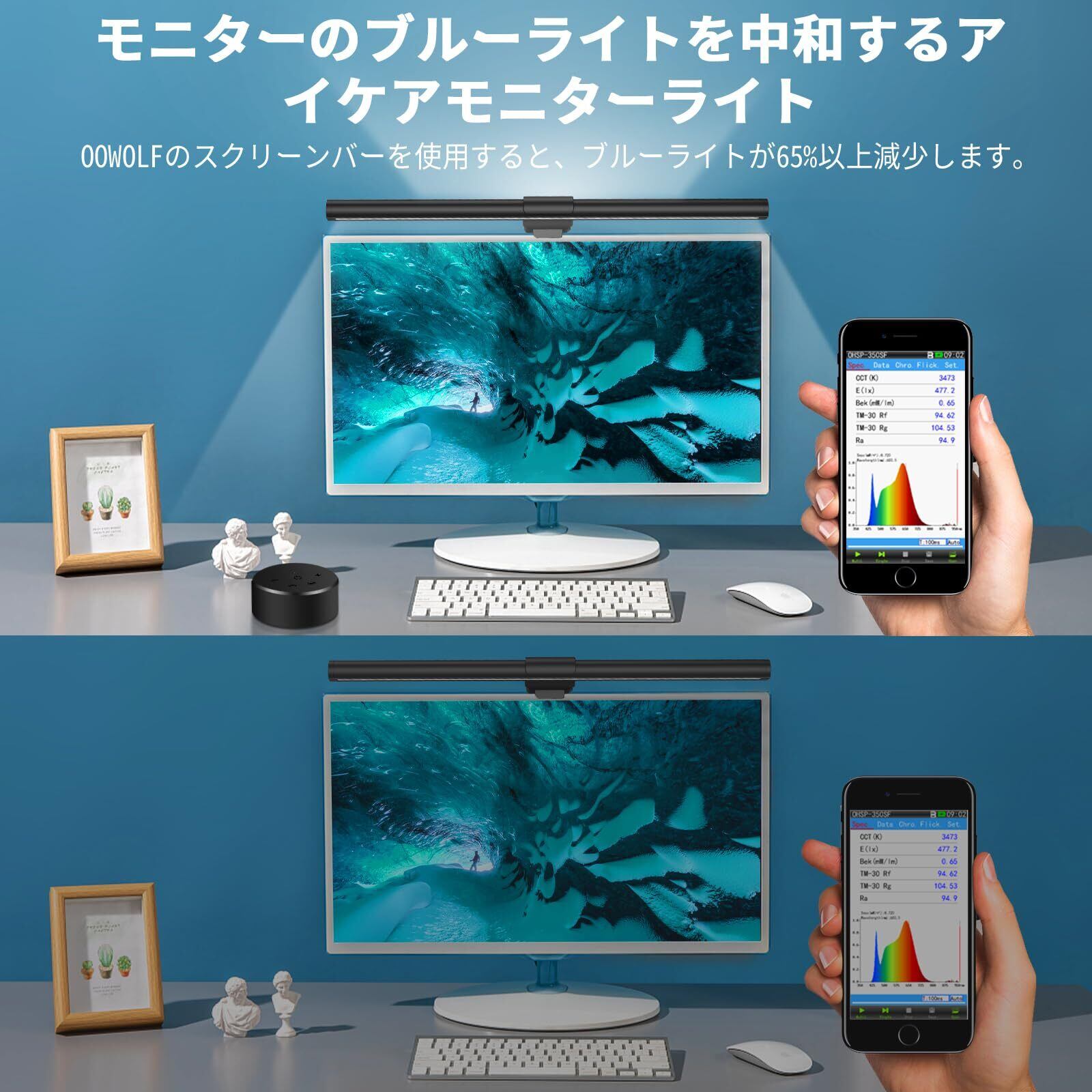 「このモニターライトは、高演色性Ra95+を実現しており、明るく自然な色合いを再現します。無段階調光機能で、あなたの目の疲れを軽減しながら、シーンに合わせた最適な明るさを提供します。背面ライトが柔らかな光を放ち、視界を美しく演出します!」