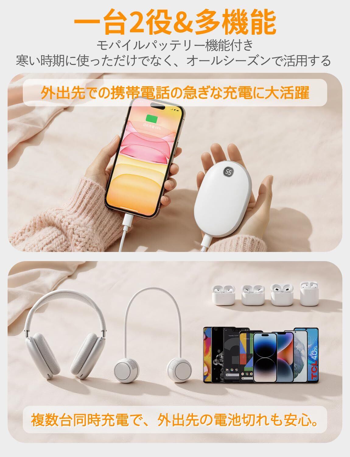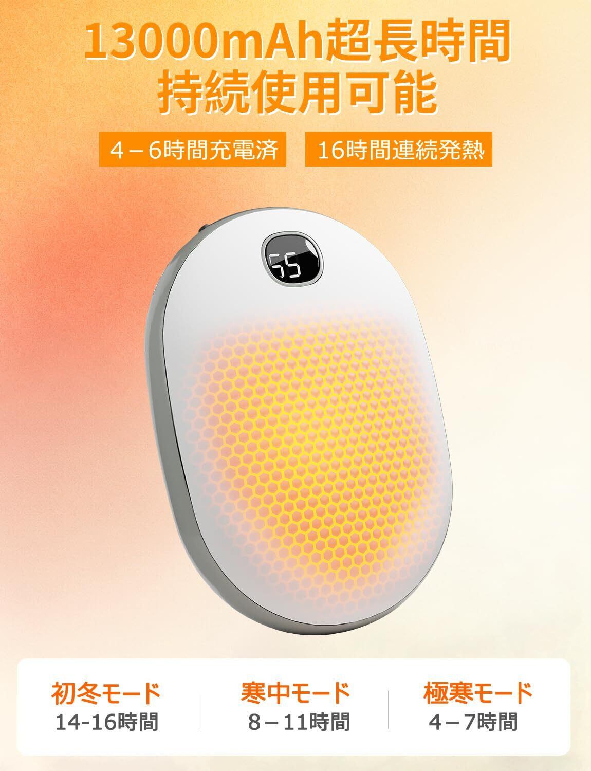 【1台2役&多機能】 13000mAhのリチウム電池が搭載され、モバイルバッテリーとしてもご利用いただけます。緊急時にスマートフォンに充電が可能で、利便性をアップします。また、通常の使い捨てカイロとは違い、つけたり消したりでき、省エネで環境に優しい充電カイロです。