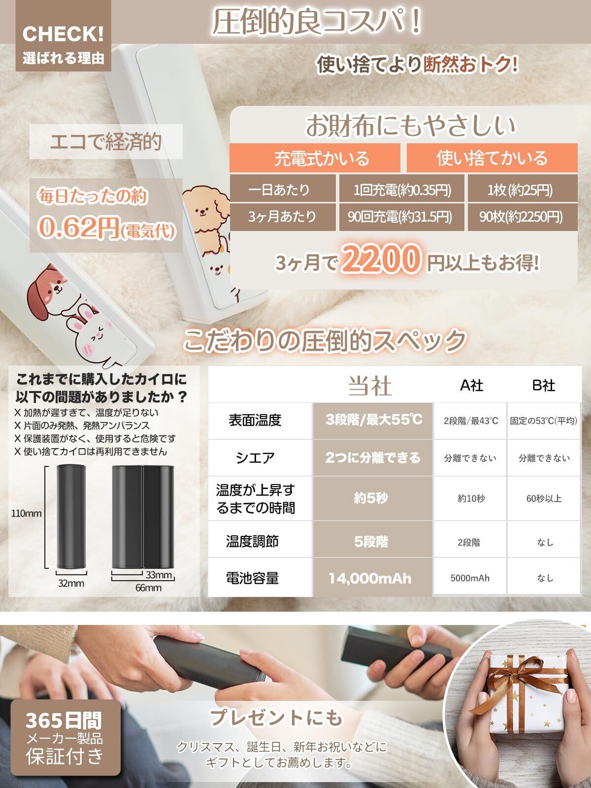 「PSE認証を取得しており、安全に使える設計となっています。過充電防止や過熱保護など、安心のセキュリティ機能が充実。快適で安全な暖かさを実現します。」