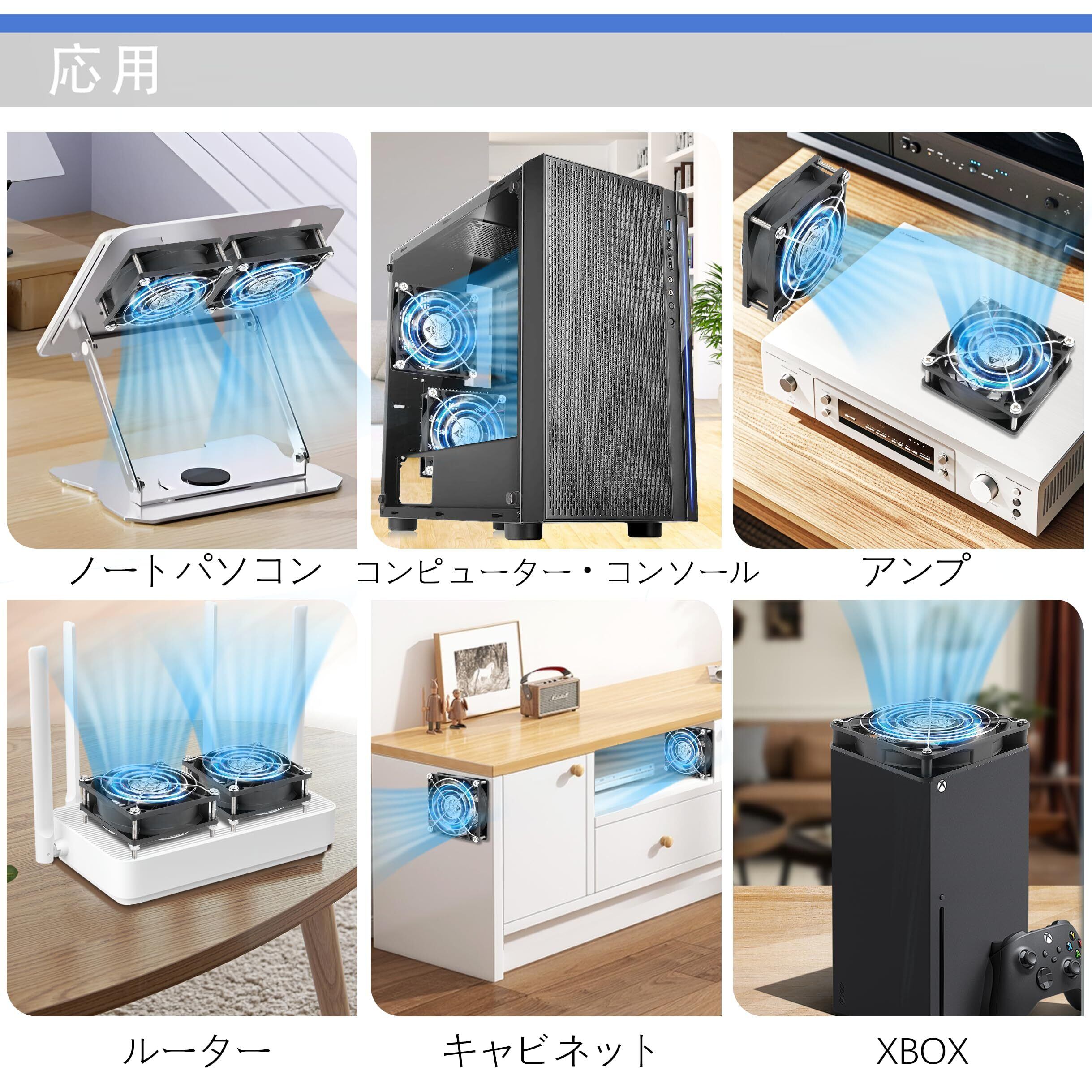「この小型ファンは、卓上扇風機としても、DVRやゲーム機の冷却用ファンとしてもお使いいただけます。コンパクトながらもパワフルで、暑い季節でも快適な環境を提供します。電源はUSBに対応しているため、さまざまなデバイスと簡単に接続可能です。」