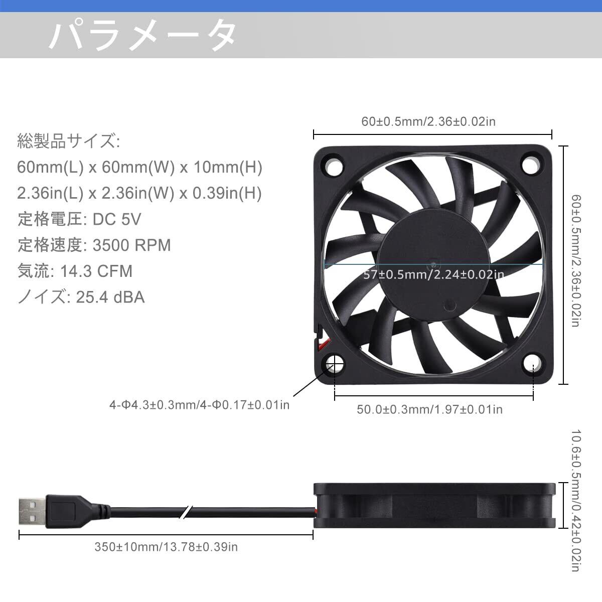 ❀パラメータ:定格電圧:5V、定格電流:0.18A、定格速度:3500RPM、風量:14.3CFM、騒音:25.4dBA