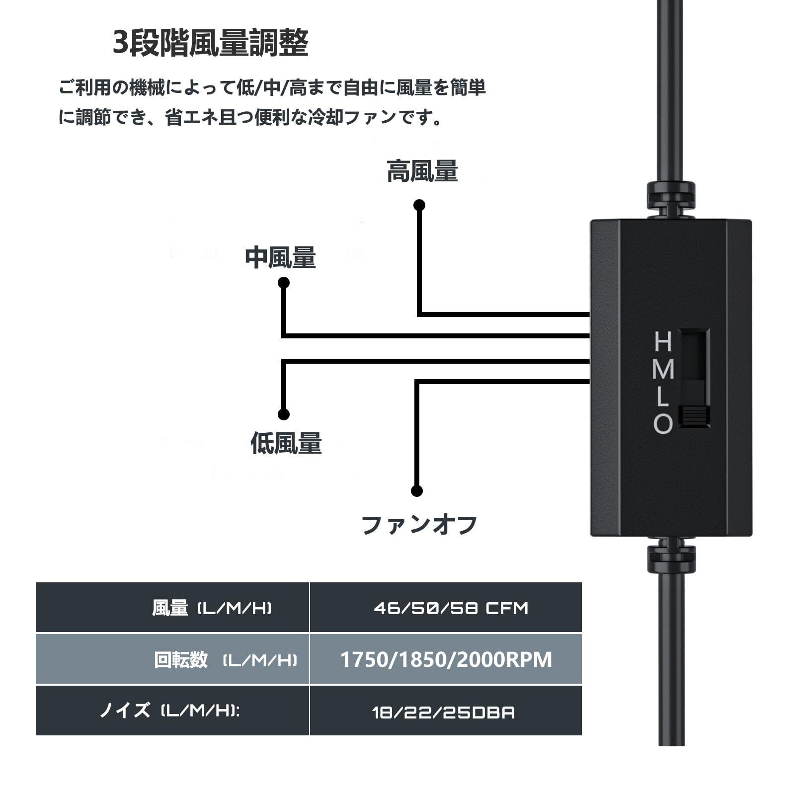 【3段階風量調整超便利】ファンの回転のコントローラーは2個付属しており、個別の風量調整できます、弱中強のスイッチあるで、3段階回転スピードの調整できるため、ご利用環境により、騒音及び風量の調整も可能になります。最大回転速度2000PRMで様々な電子機械の快速に冷却に大活躍です。