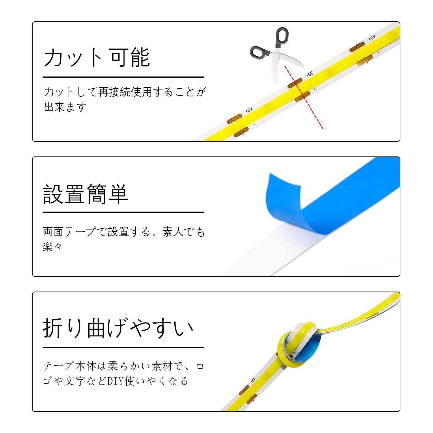 「このLEDテープライトはカット可能なので、必要な長さに合わせて自由にカスタマイズできます。両面テープで簡単に設置できるため、壁や家具に手軽に取り付けられ、特別なツールも不要です。多彩な飾り方が楽しめます!」