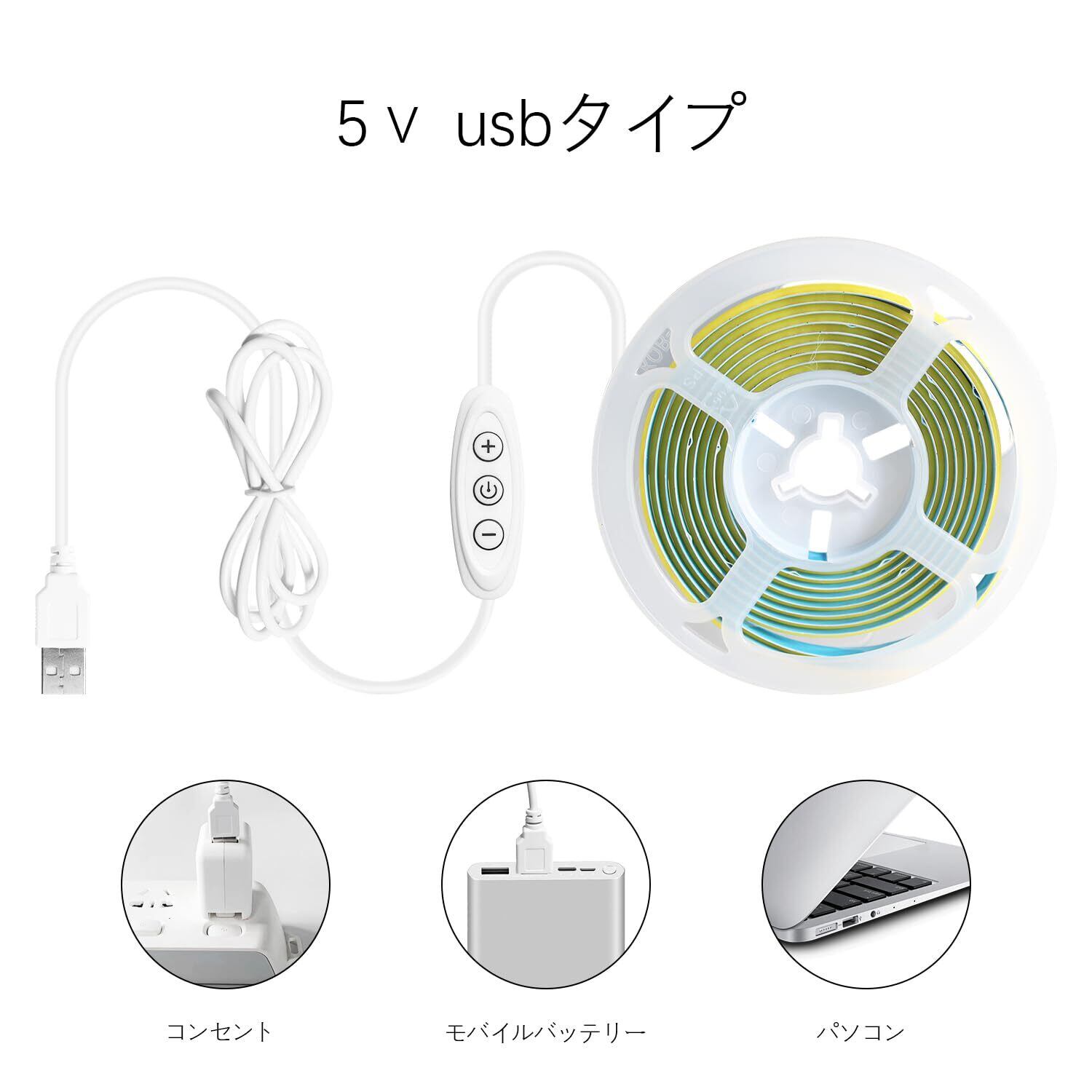 iNextStation ledテープライト COB USBライト 高密度 入電電圧5v 320LEDs/m 調光可能 カット可能 両面テープ設置 幅8mm 飾り用 昼光色テープライト 2M ホワイト