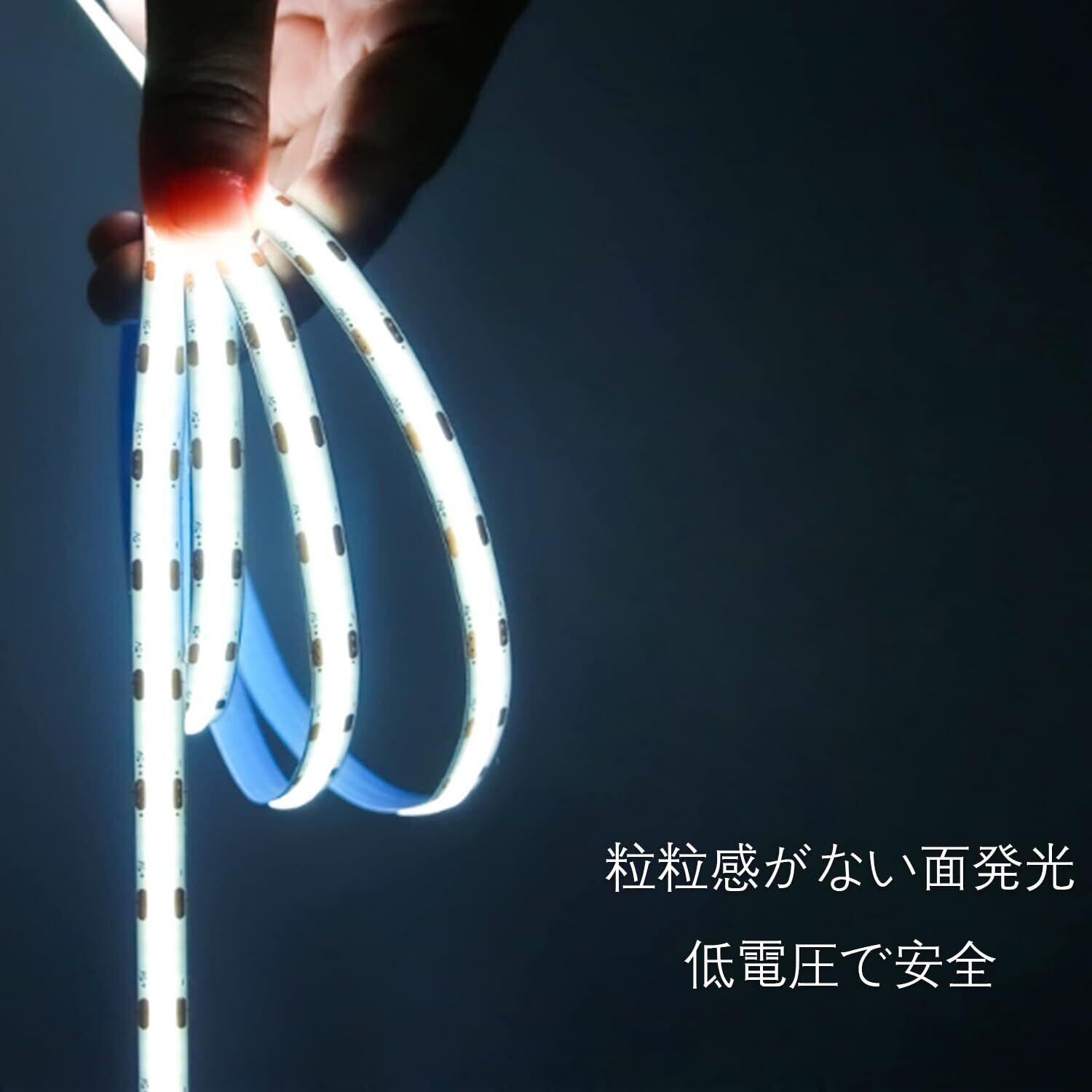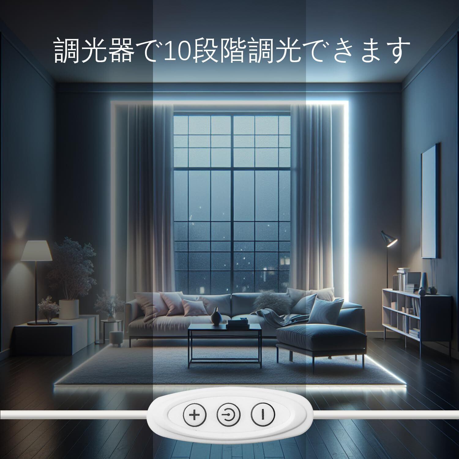 「調光可能なこのテープライトは、昼光色で明るくクリーンな印象を与えます。リラックスタイムや集中したい作業時、場面に合わせた明るさを選べるのが特徴です。理想の空間を実現するための強力なサポートをします。」