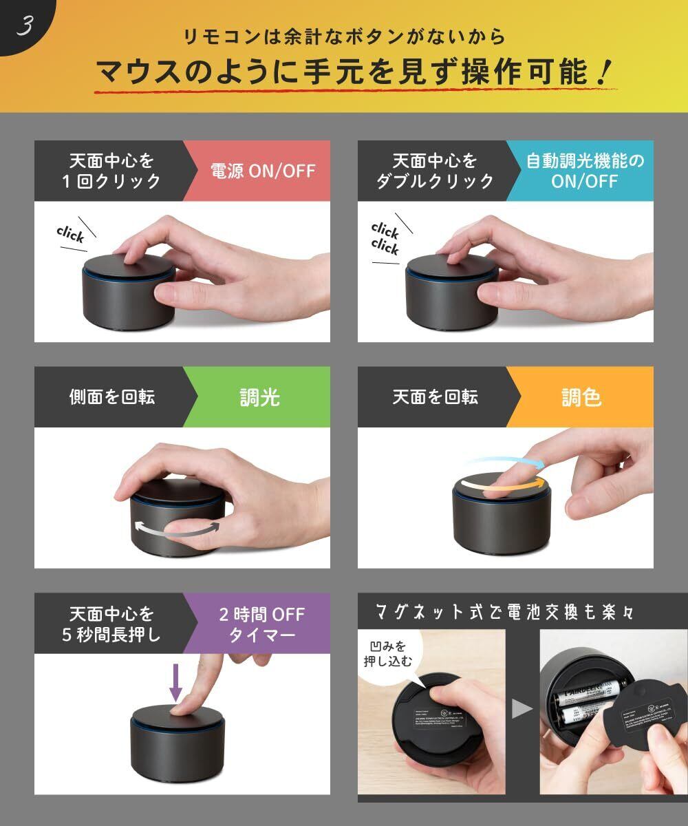 【色温度】3000-6000K【演色性】Ra>95【ルーメン値】最大275LM【付属品】無線リモコン、単4形電池×2(テスト用) 、調節カバー×3(Aは開封時装着済み)、六角レンチ×2、USB電源接続コード (TypeA→TypeC)約1.8m、取扱説明書