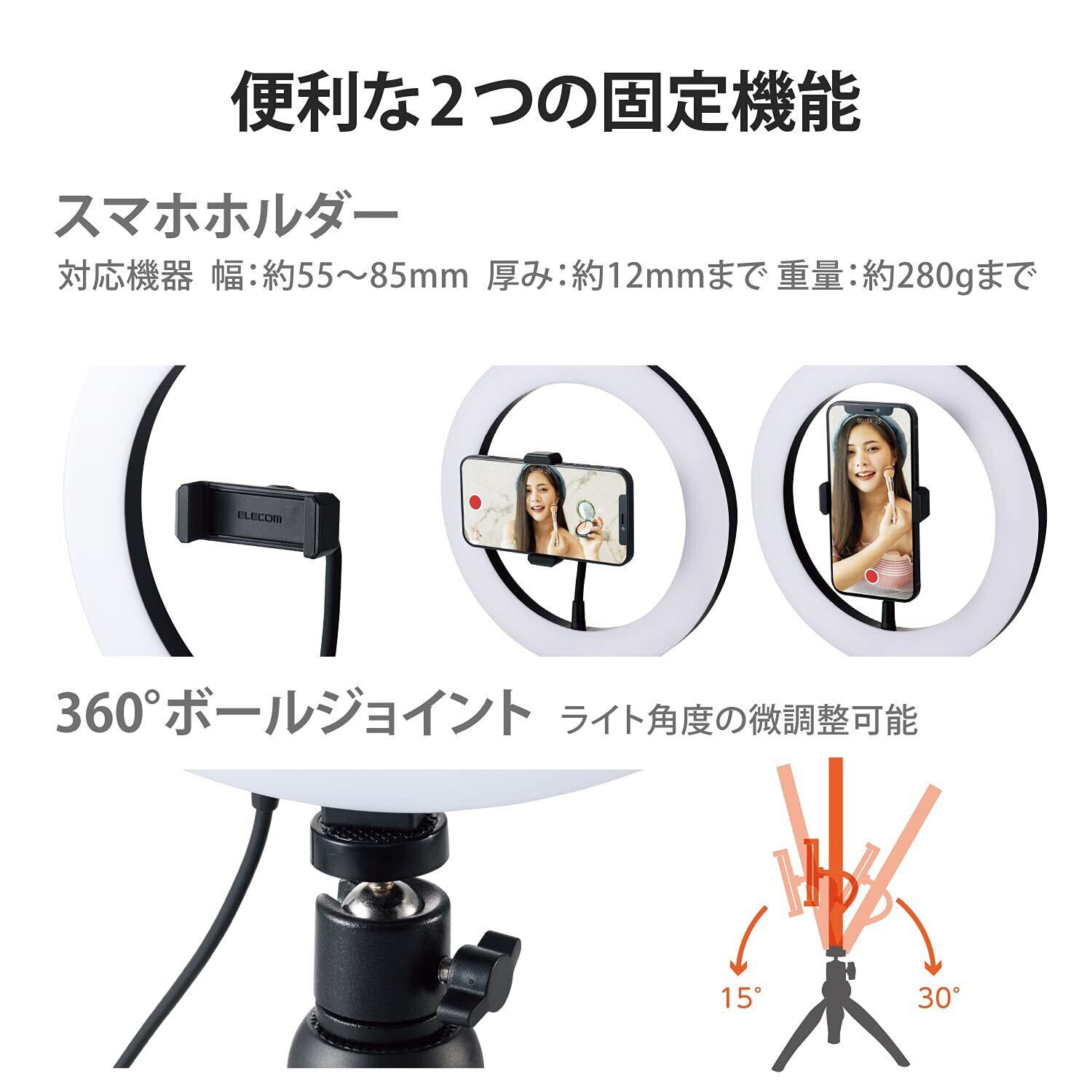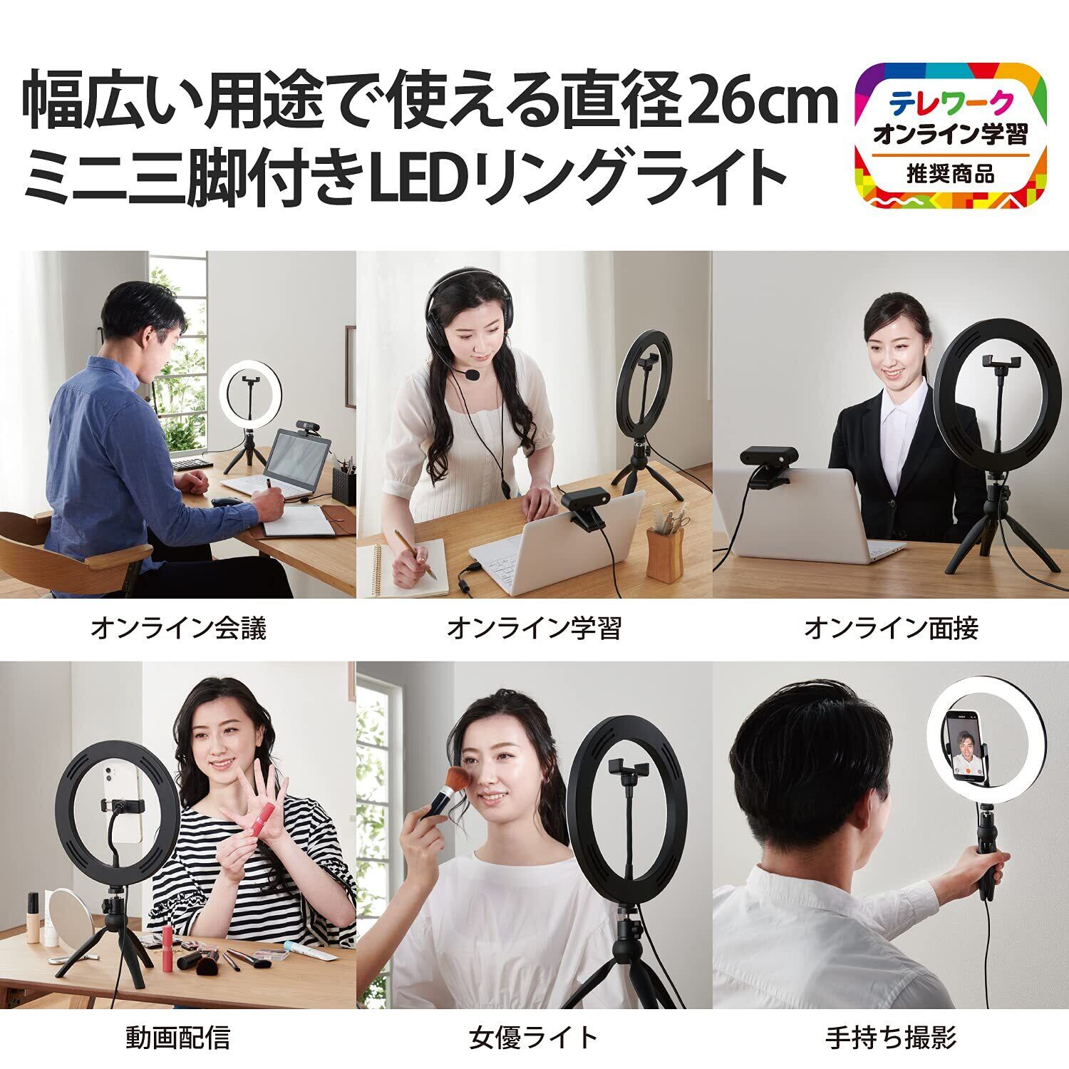 エレコム LED リングライト 三脚 26cm 3色モード / 10段階調光 USB給電 ブラック DE-L03BK